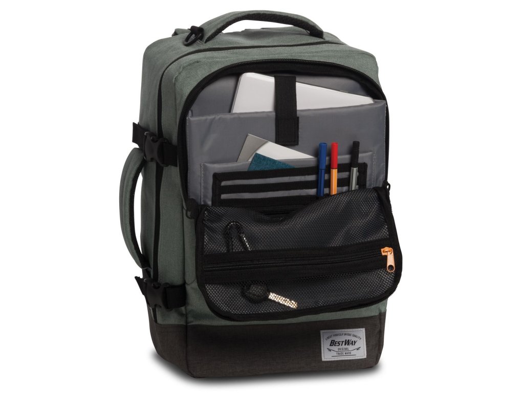 Batoh - taška, vyroben z vysoce kvalitní odolné látky POLYESTER 600D. Díky svým rozměrům dokonale vyhovuje současným požadavkům RYANAIR jako volné příruční zavazadlo.