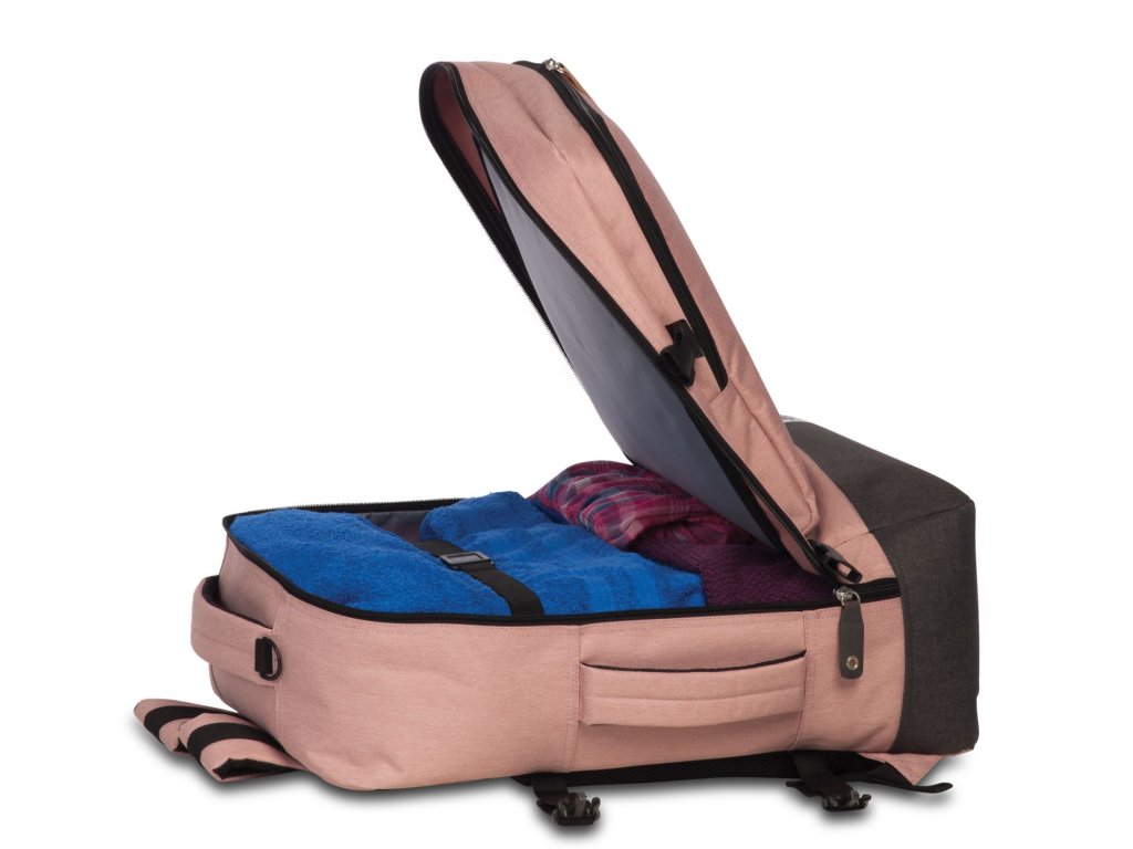 Batoh má nastavitelné výztuhy a pásek, který vám umožní připevnit batoh k výsuvné rukojeti kufru, což vám usnadní cestování. Textilní rukojeť pro přenášení batohu. Batoh má velký hlavní kapsu a přední kapsu. Batoh se otevírá zipem.