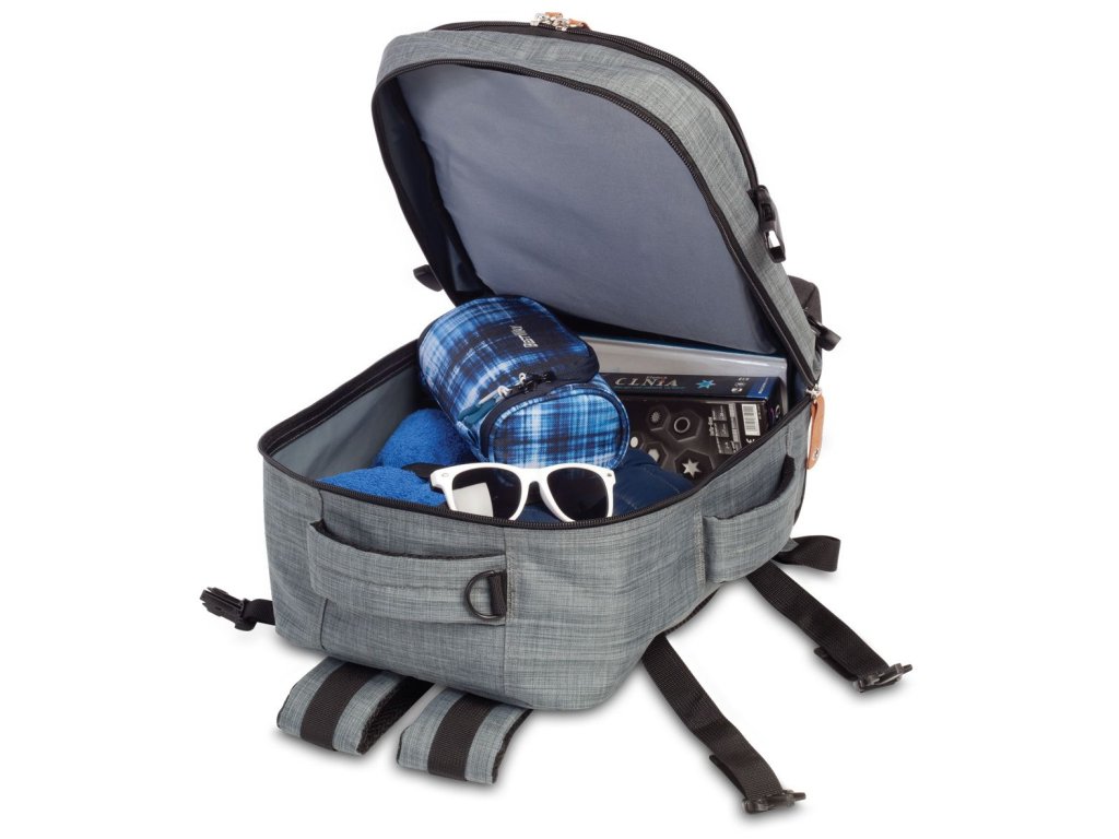 Batoh má nastavitelné výztuhy a pásek, který vám umožní připevnit batoh k výsuvné rukojeti kufru, což vám usnadní cestování. Textilní rukojeť pro přenášení batohu. Batoh má velký hlavní kapsu a přední kapsu. Batoh se otevírá zipem.