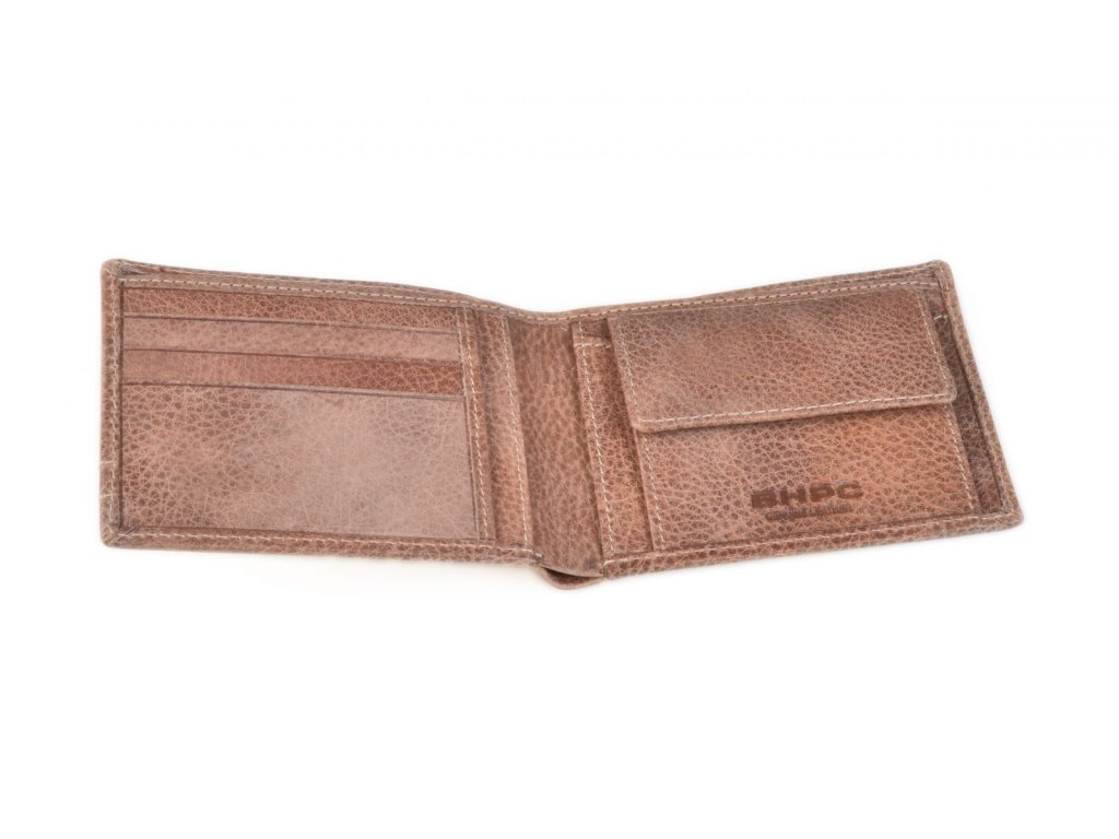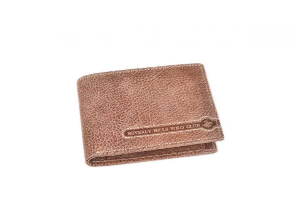 Pánská celokožená peněženka z kolekce značky Beverly Hills Polo Club v hnědé barvě linie Tucson, přihrádka na bankovky, kapsa na doklady a organizér na platební karty, kapsa na mince na patent.