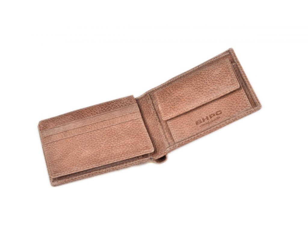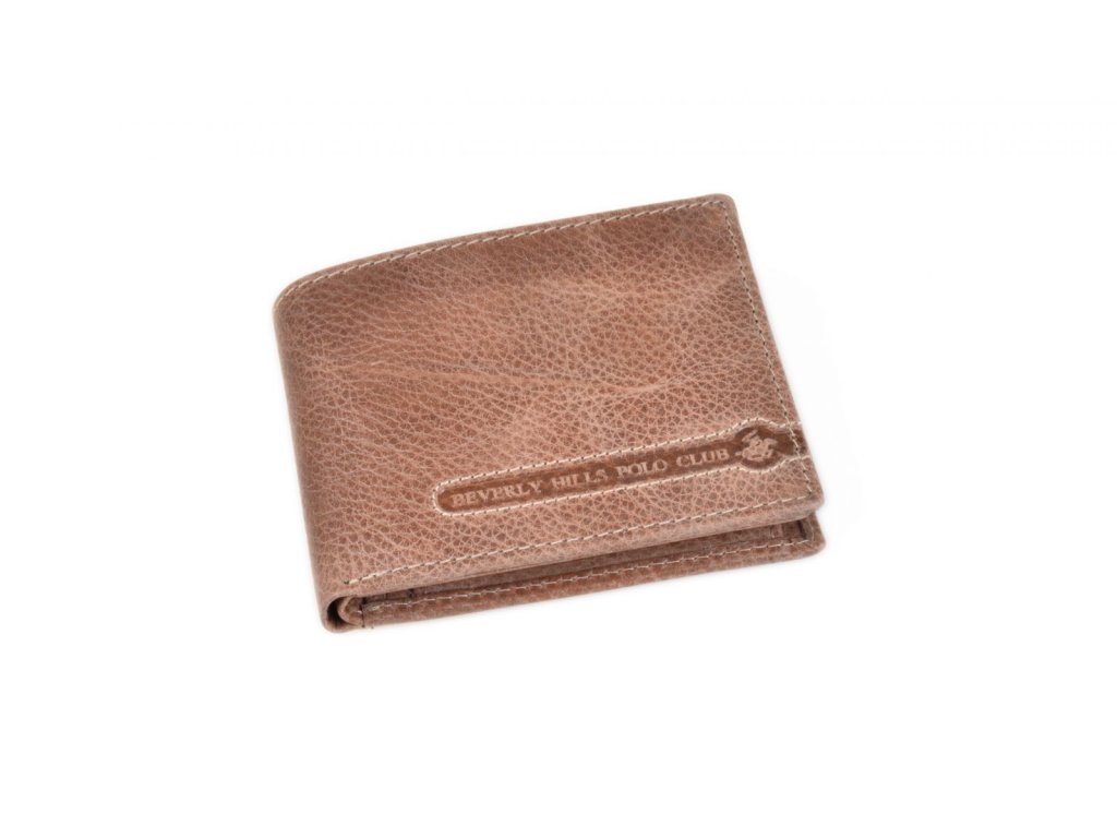 Pánská celokožená peněženka z kolekce značky Beverly Hills Polo Club v tabákové barvě linie Tucson, přihrádka na bankovky, kapsa na doklady a organizér na platební karty, kapsa na mince na patent.