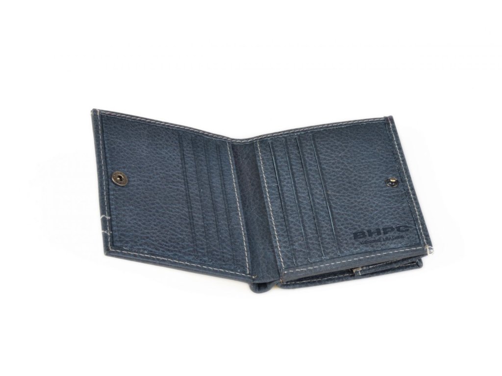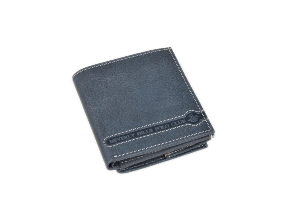 Pánská celokožená peněženka z kolekce značky Beverly Hills Polo Club v modré barvě linie Tucson, přihrádka na bankovky, kapsa na doklady a organizér na platební karty, dvě kapsy na mince a obě jsou na patent.