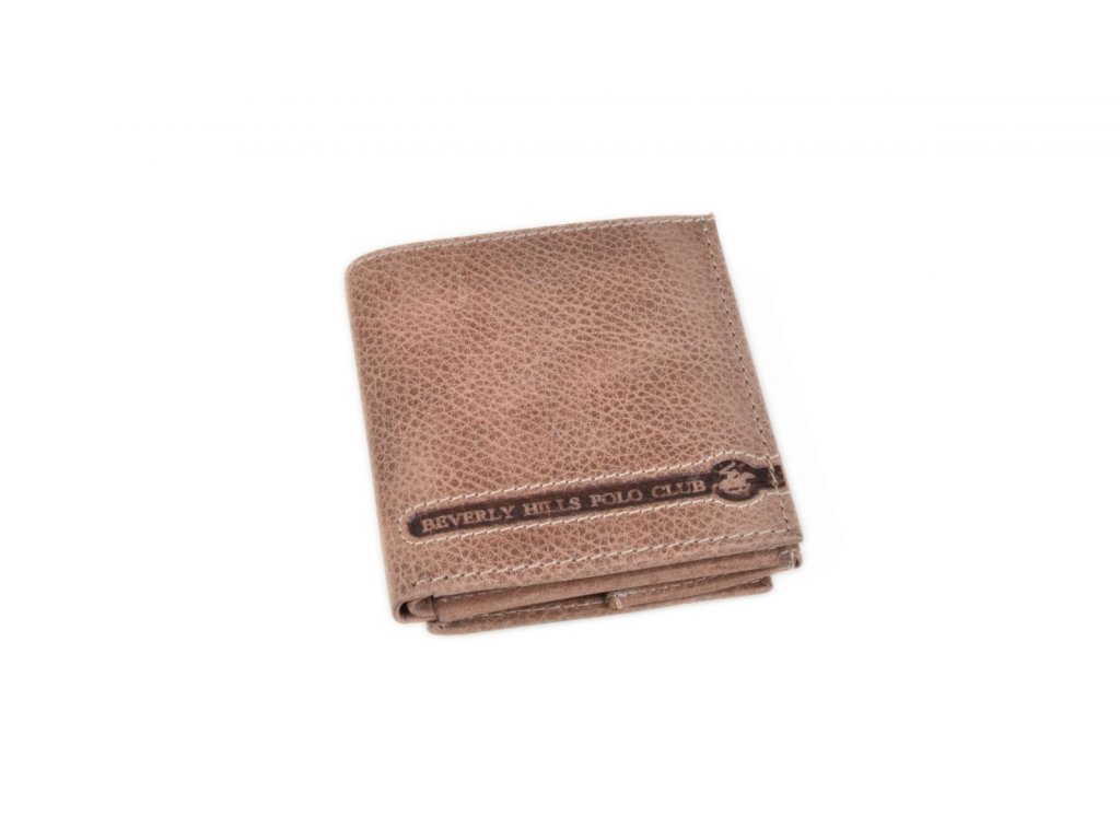 Pánská celokožená peněženka z kolekce značky Beverly Hills Polo Club v hnědé barvě linie Tucson, přihrádka na bankovky, kapsa na doklady a organizér na platební karty, dvě kapsy na mince a obě jsou na patent.