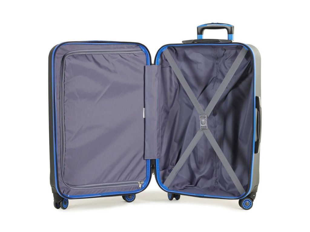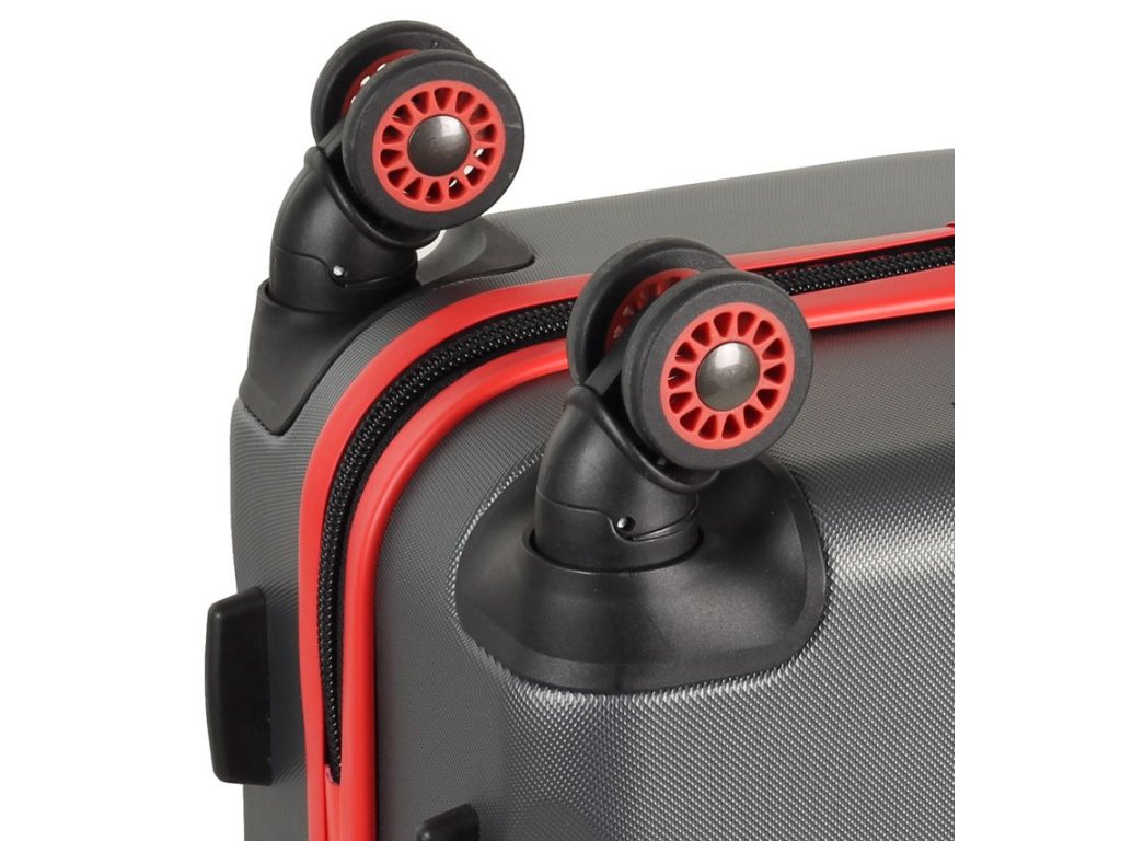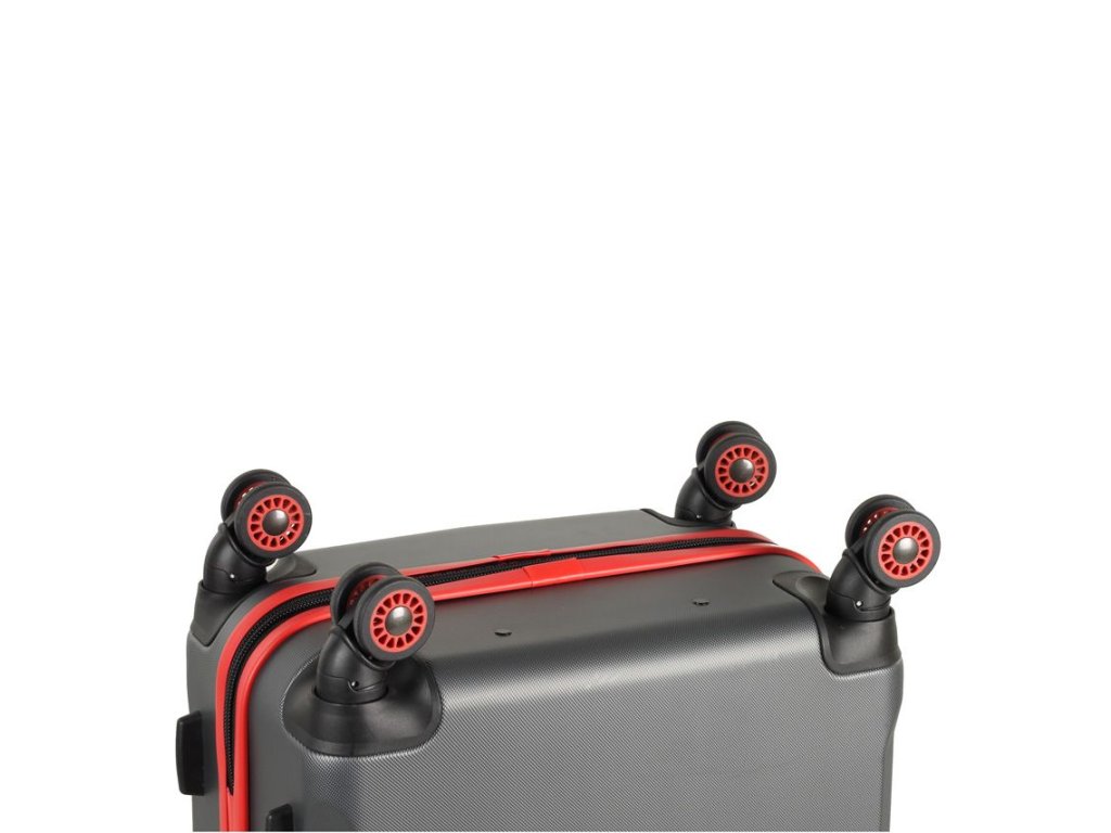 Boční i horní madlo je plastové. Celý pojízdný systém je umístěn uvnitř kufru pod textilní podšívkou, aby nedošlo k poškození systému při přepravě a je opatřen čtyřmi dvojitými kolečky otočnými o 360°. Vnitřek kufru lze rozdělit pomocí textilní přepážky.