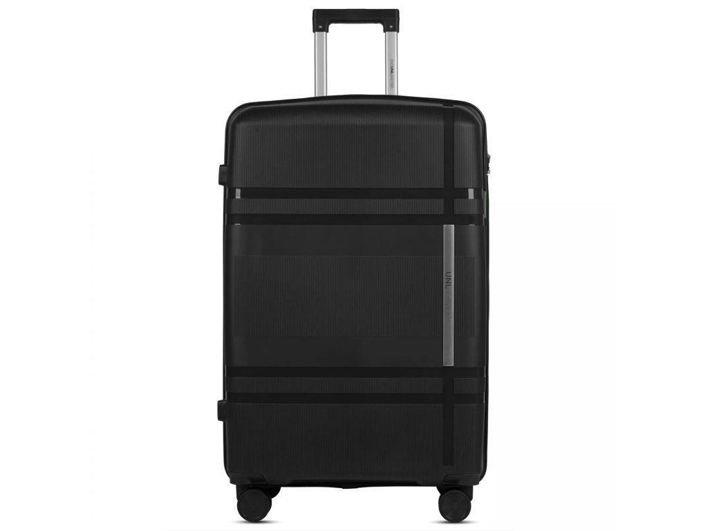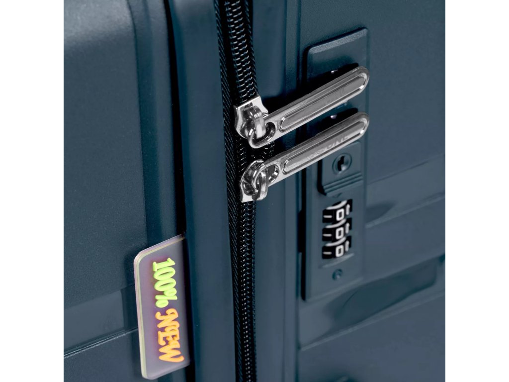 Oba jezdce zipu se dají zapojit do kódového zámku. Horní madlo je plastové. Celý pojízdný systém je umístěn uvnitř kufru pod textilní podšívkou, aby nedošlo k poškození systému při přepravě a je opatřen čtyřmi kolečky otočnými o 360°.