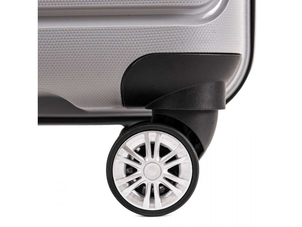 Oba jezdce zipu se dají zapojit do kódového zámku. Horní madlo je plastové. Celý pojízdný systém je umístěn uvnitř kufru pod textilní podšívkou, aby nedošlo k poškození systému při přepravě a je opatřen čtyřmi kolečky otočnými o 360°.