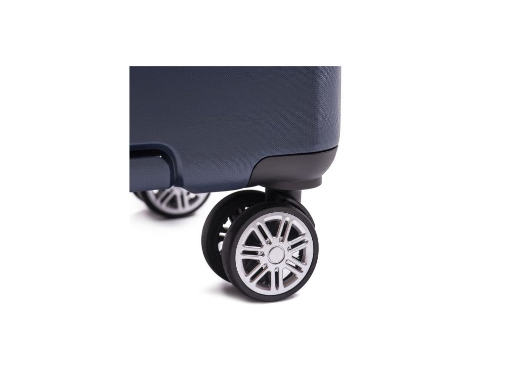 Oba jezdce zipu se dají zapojit do kódového zámku. Horní madlo je plastové. Celý pojízdný systém je umístěn uvnitř kufru pod textilní podšívkou, aby nedošlo k poškození systému při přepravě a je opatřen čtyřmi kolečky otočnými o 360°.