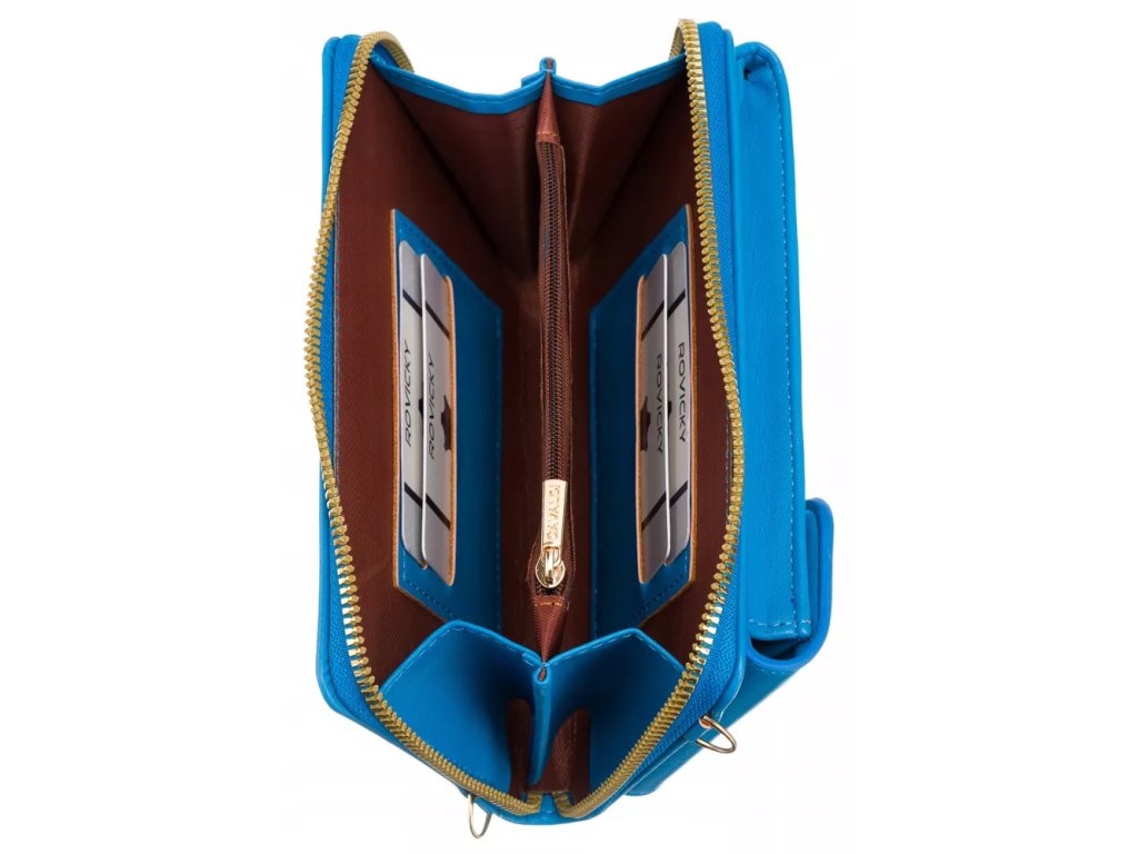 - Kabelka-peněženka je vyrobena z vysoce kvalitní ekokůže. Uvnitř tašky jsou praktické přihrádky na karty. Na přední straně je praktická kapsa na telefon se zapínáním na patentky. Peněženka je dodávána s odnímatelným popruhem s nastavitelnou délkou.