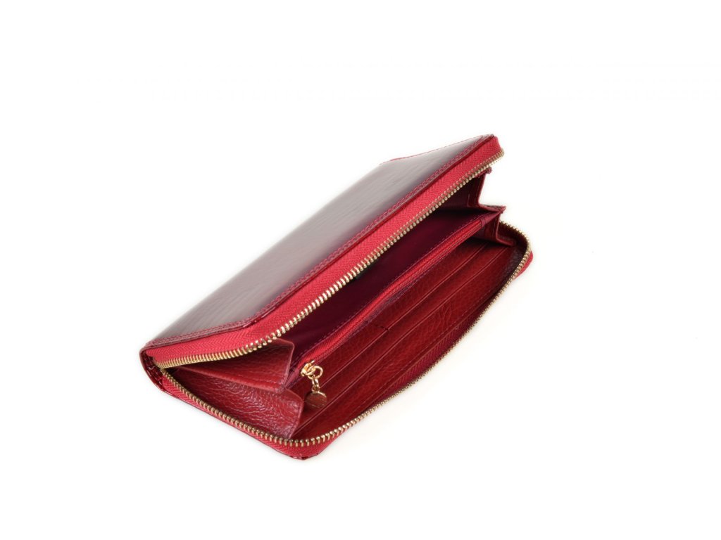 Dámská peněženka s hlavním uzavěrem na zip, první komora přihrádka na bankovky, kapsa na mince s uzavřením na zip, kapsa na doklady, organizér na platební karty.