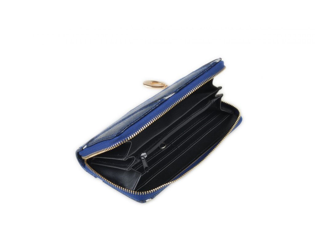 Dámská peněženka s hlavním uzavěrem na zip, první komora přihrádka na bankovky, kapsa na mince s uzavřením na zip, kapsa na doklady, organizér na platební karty.