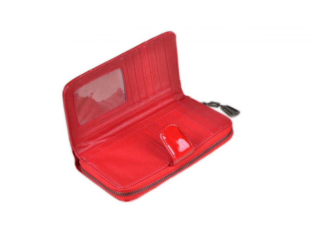 Dámská dvoukomorova peněženka, první komora přihrádka na bankovky, kapsa na mince s uzavřením na zip. Druha komora kapsa na doklady, organizér na platební karty, uzavření na patent.