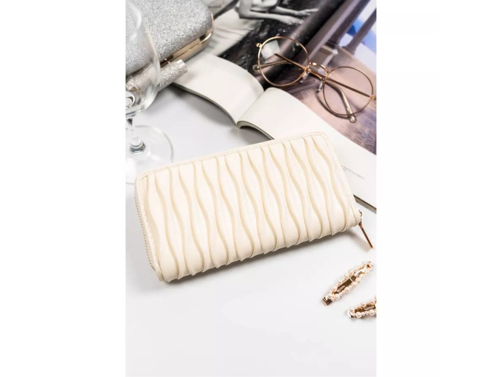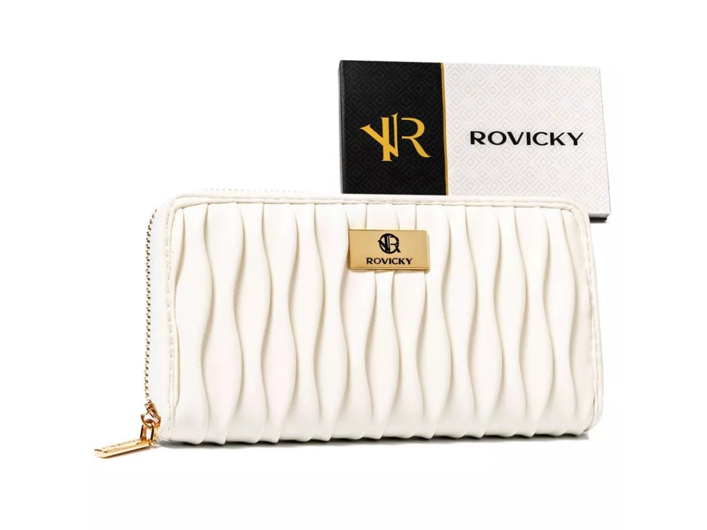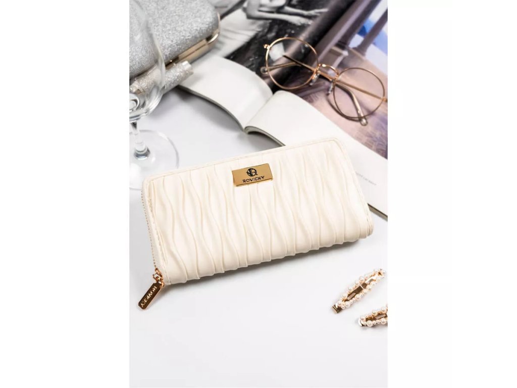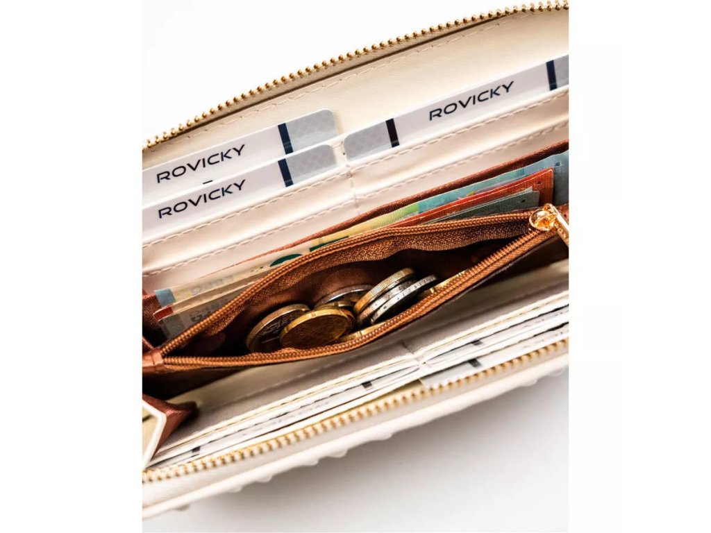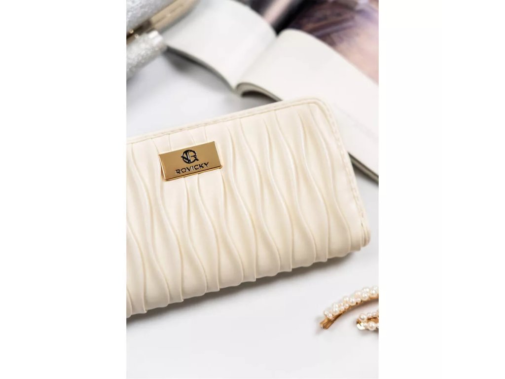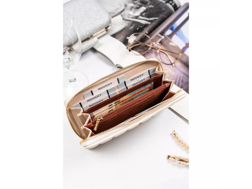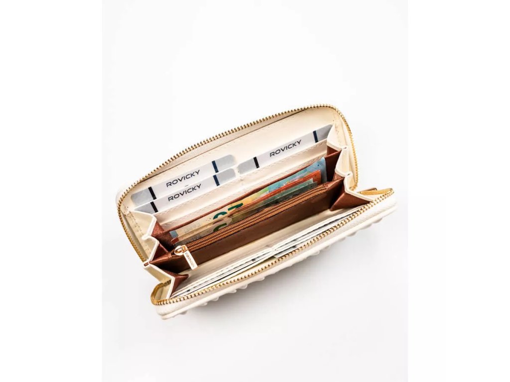 - Tato dámská peněženka-penál je vyrobena z umělé kůže, zdobená volánky a zlatými kování. Má 10 přihrádek na karty a doklady a také klasickou přihrádku na hotovost. Slouží také k uložení technického průkazu vozidla. Dodává se v krabičce od výrobce.
