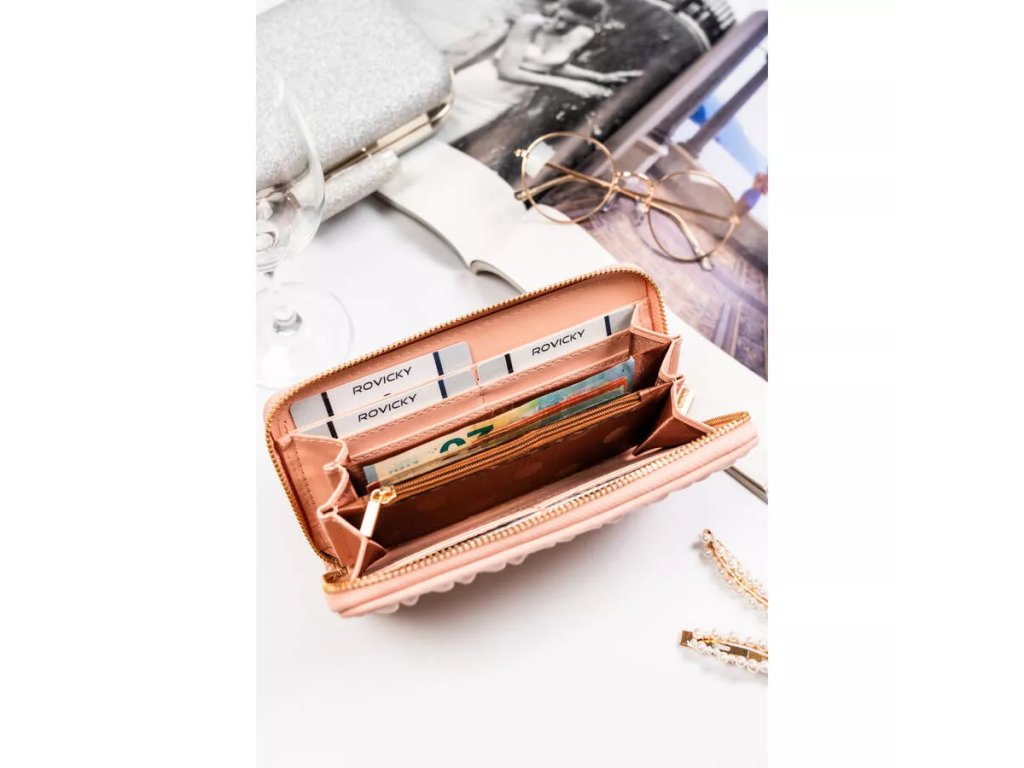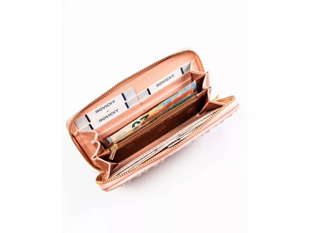 - Tato dámská peněženka-penál je vyrobena z umělé kůže, zdobená volánky a zlatými kování. Má 10 přihrádek na karty a doklady a také klasickou přihrádku na hotovost. Slouží také k uložení technického průkazu vozidla. Dodává se v krabičce od výrobce.