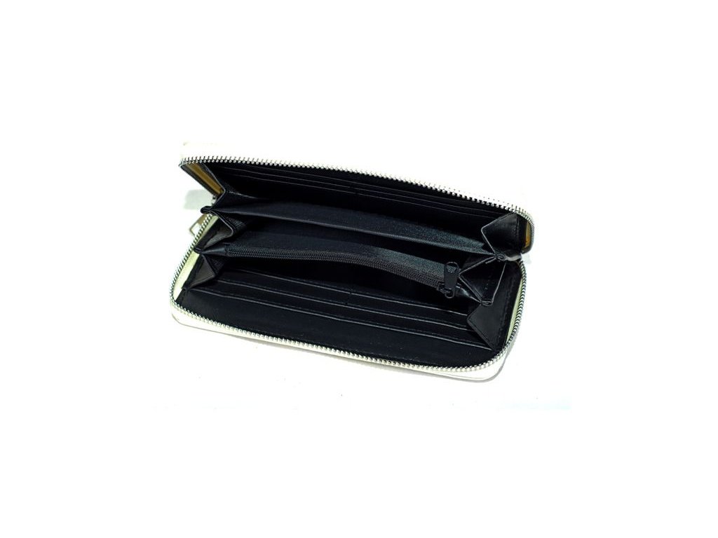 Dámská peněženka s hlavním uzavěrem na zip, první komora přihrádka na bankovky, kapsa na mince s uzavřením na zip, kapsa na doklady, organizér na platební karty.
