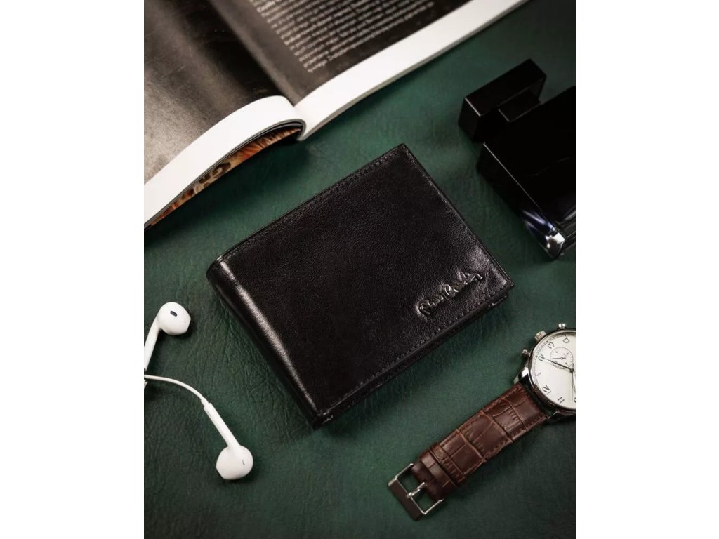 Peněženka vyrobená z vysoce kvalitní přírodní kůže . Model klasického designu v horizontální orientaci bez vnějšího zapínání. Přední stranu zdobí stylové logo značky. Středně velká peněženka s výbornou vnitřní organizací. Interiér je vybaven řadou praktických přihrádek. Vejde se vám do nich velké množství karet, dokladů a hotovosti.