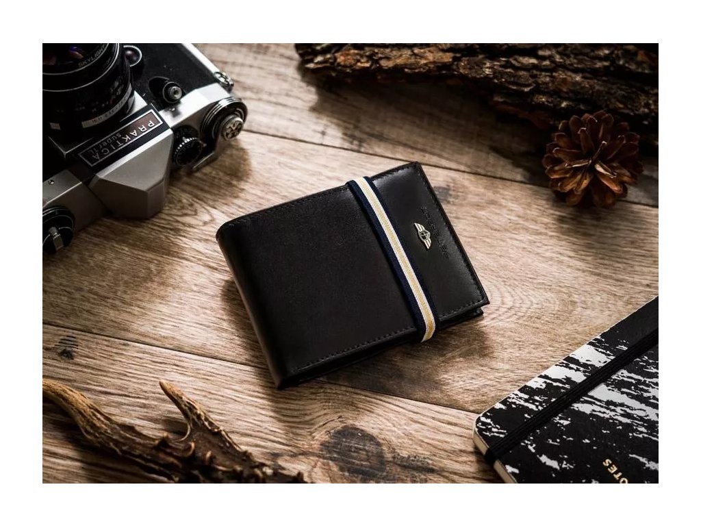 Ústředním prvkem sady je klasická peněženka vyrobená z měkké pravé kůže v tmavě černé barvě. Její minimalistický design je doplněn moderním nádechem v podobě elastické barevné stužky, která slouží jako praktická spona. Toto řešení dodává peněžence lehký a moderní vzhled, aniž by ztrácela na eleganci. Uvnitř najdete pečlivě navržené přihrádky na bankovky, karty a dokumenty, které zajišťují pohodlí a organizaci pro každodenní použití.
