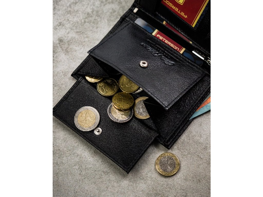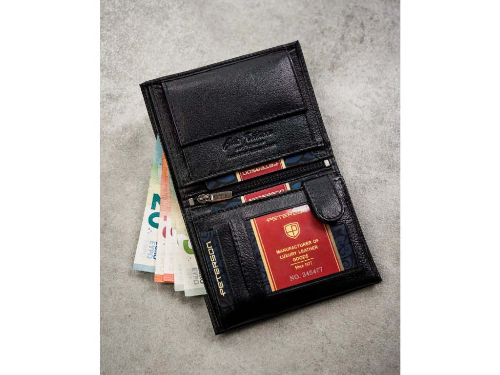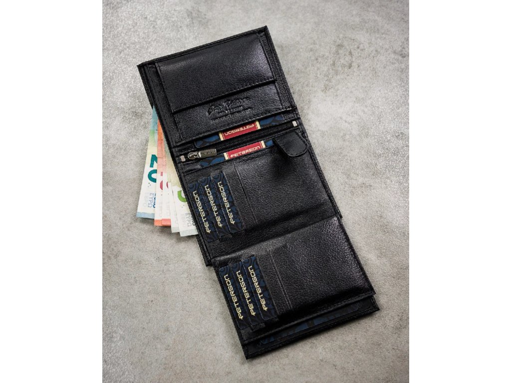Tato peněženka zaujme svým klasickým tvarem a bezchybným provedením. Je vybavena inovativní technologií ochrany dat RFID STOP a poskytuje zabezpečení proti elektronické krádeži. Její minimalistický design zdůrazňuje její mužný charakter, zatímco decentní logo Peterson dodává punc prestiže. Promyšlený interiér nabízí řadu přihrádek na karty, dokumenty a bankovky, což z ní činí nejen elegantní, ale i funkční každodenní doplněk.