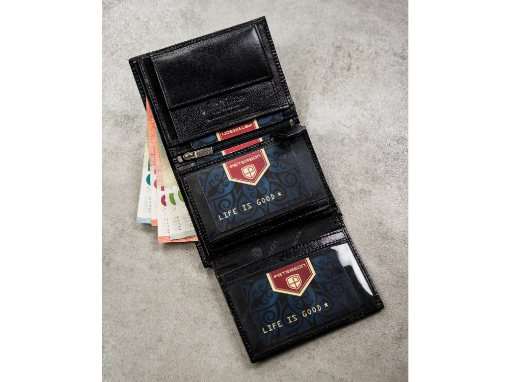 Tato peněženka zaujme svým klasickým tvarem a bezchybným provedením. Je vybavena inovativní technologií ochrany dat RFID STOP a poskytuje zabezpečení proti elektronické krádeži. Její minimalistický design zdůrazňuje její mužný charakter, zatímco decentní logo Peterson dodává punc prestiže. Promyšlený interiér nabízí řadu přihrádek na karty, dokumenty a bankovky, což z ní činí nejen elegantní, ale i funkční každodenní doplněk.
