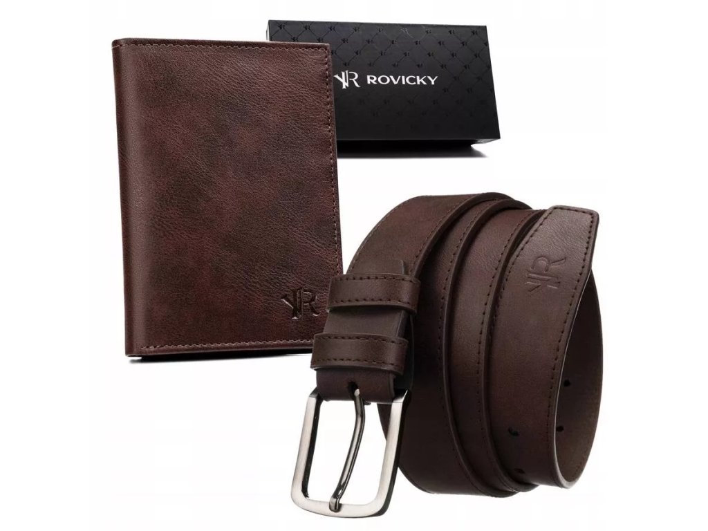 Dvoudílná pánská dárková sada: Rovicky kožený opasek a peněženka R-N004-120 Hnědá