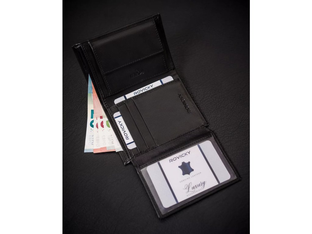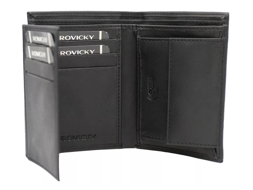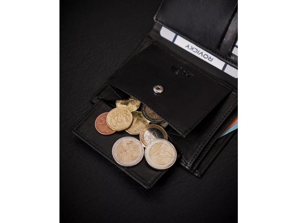 Tato peněženka zaujme svým klasickým tvarem a bezchybným provedením. Je vybavena inovativní technologií ochrany dat RFID STOP a poskytuje zabezpečení proti elektronické krádeži. Její minimalistický design zdůrazňuje její mužný charakter, zatímco decentní logo Rovicky dodává punc prestiže. Promyšlený interiér nabízí řadu přihrádek na karty, dokumenty a bankovky, což z ní činí nejen elegantní, ale i funkční každodenní doplněk.
