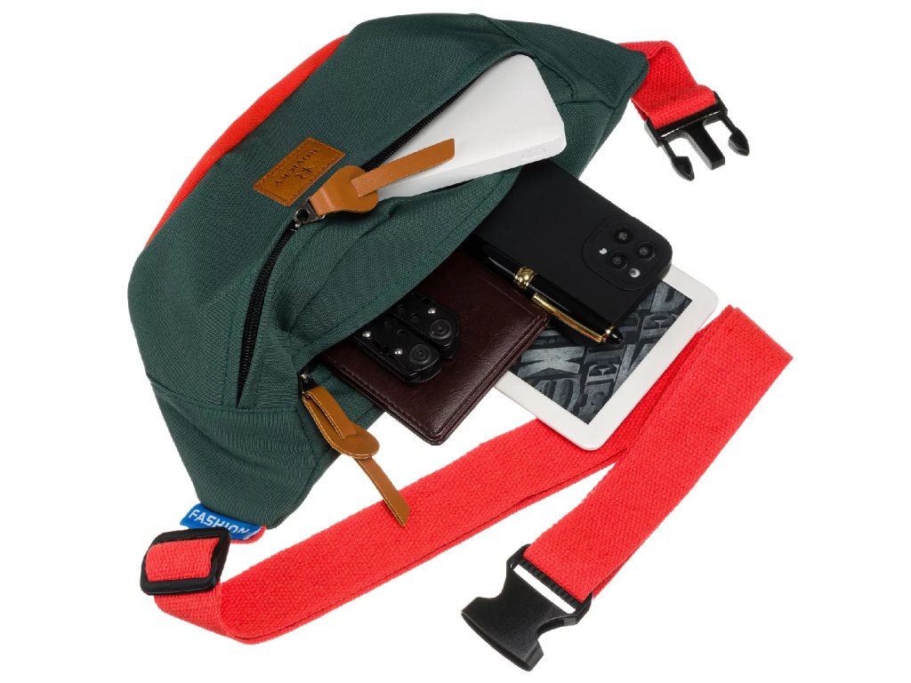 vyrobena z vysoce kvalitního polyesteru prostorná hlavní komora uzavíratelná na zip, uvnitř otevřená kapsa vnější kapsa umístěná na přední straně tašky, uzavíratelná na zip nastavitelný popruh