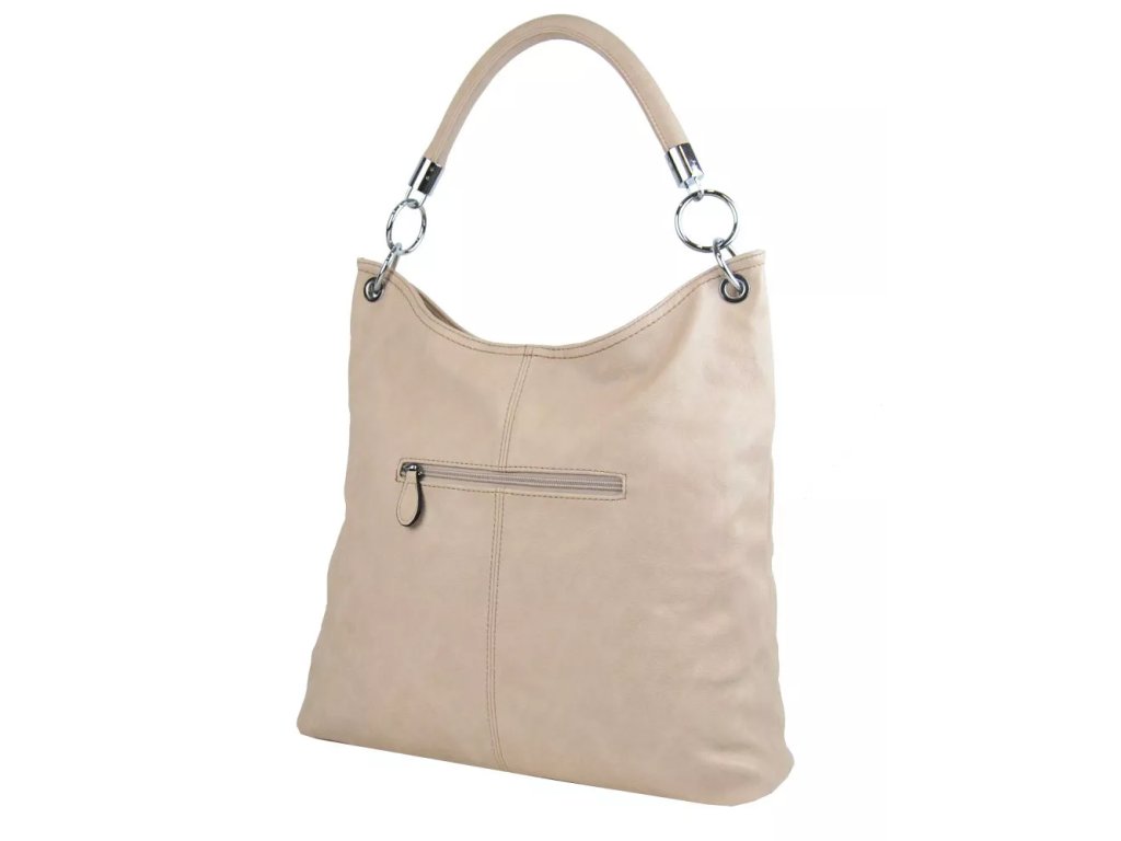 Velká moderní kabelka na rameno od výrobce Mahel. Kabelka má jedno ucho vysoké 25 cm pro velmi pohodlné nošení na rameni. Do kabelky se vstupuje zipem. Vnitřní prostor je řešen látkovou přepážkou, která sahá do poloviny výšky kabelky. Vnitřní boční kapsa na zip. Na zadní straně je umístěna zipová kapsa. Kovové doplňky jsou ve stříbrné barvě.