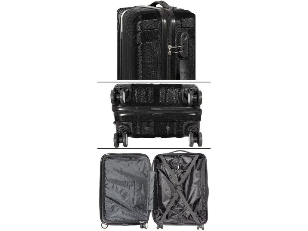 Moderní kufr z tvrdého plastu, vydrží velkou zátěž. Oba jezdce zipu se dají zapojit do kódového zámku. Horní madlo je plastové. Celý pojízdný systém je umístěn uvnitř kufru pod textilní podšívkou, aby nedošlo k poškození systému při přepravě a je opatřen čtyřmi kolečky otočnými o 360°. Všechny kufry jsou vyrobeny s důrazem na odolnost, výdrž a dobré vnitřní uspořádání. Po celém obvodu kufru se nachází dělící stěna umožňující umístění věcí obou stran. Malý kufr odpovídá definici příručního zavazadla a lze si ho vzít s sebou například i do letadla či autobusu. Jedná se samozřejmě o stoprocentně nepromokavý materiál. Pro pohodlné převážení z místa na místo je kufr vybaven čtyřmi kolečky, které se otáčejí v plném rozsahu 360°. Dále má i dvě držadla (jedno z nich je na dně kufru), aby se snadněji přenášel. Pro snazší umístění zámku má kufr dvoucestný zip s očky. Kromě hlavního úložného prostoru má, upínací popruhy a síťové kapsy se zapínáním na zip.