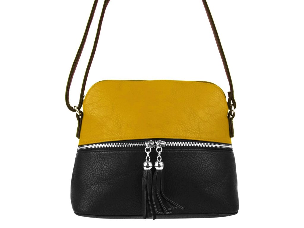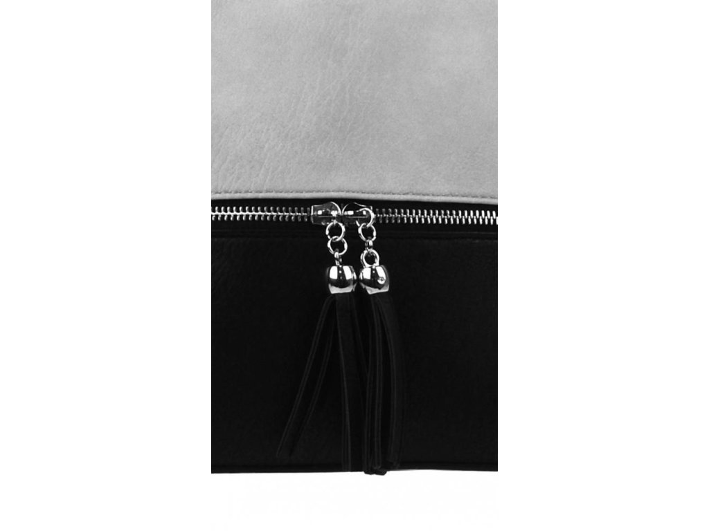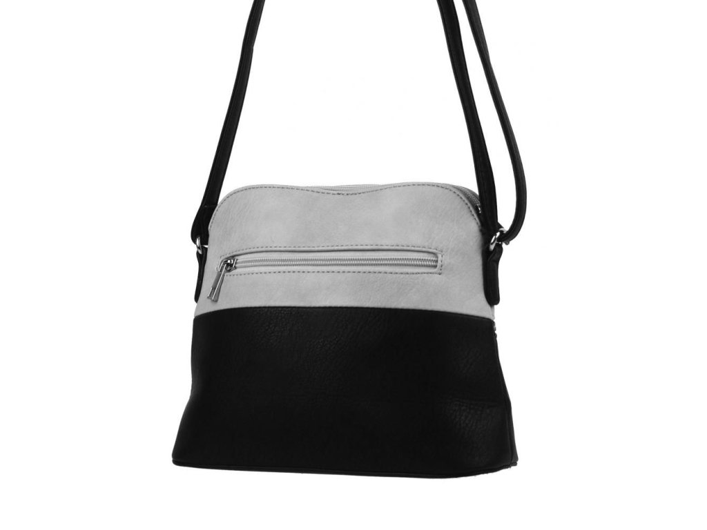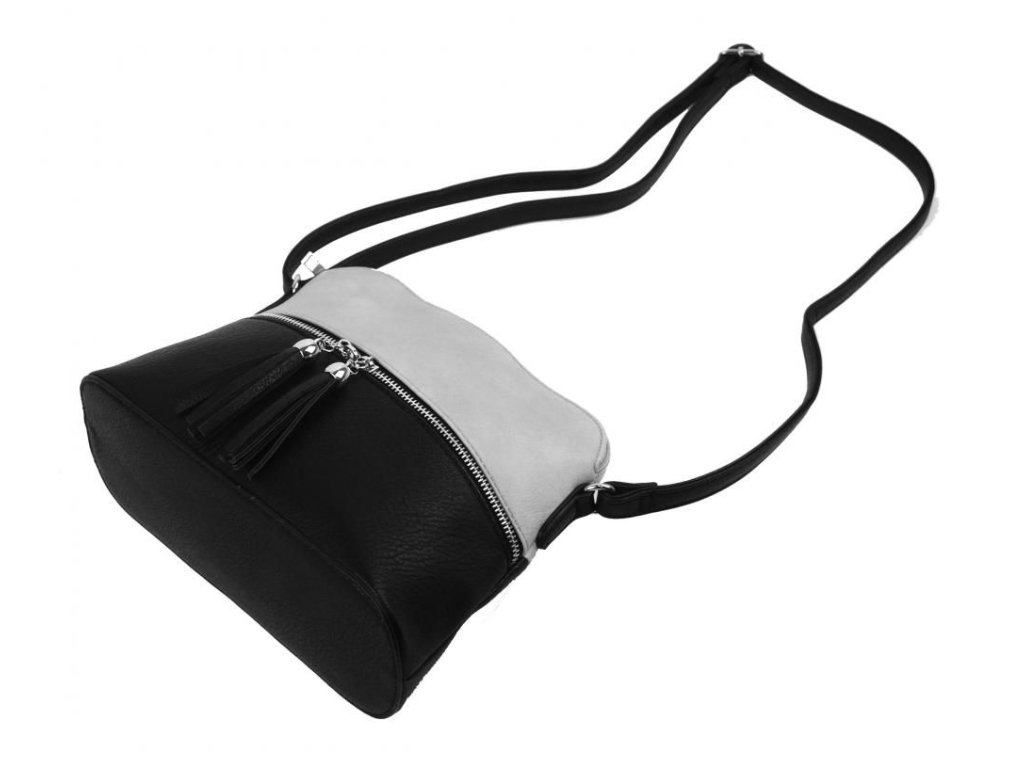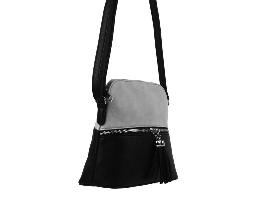 Půvabná malá crossbody kabelka s nastavitelným páskem do 140 cm zaujme stříbrným čelním zipem s ozdobami.