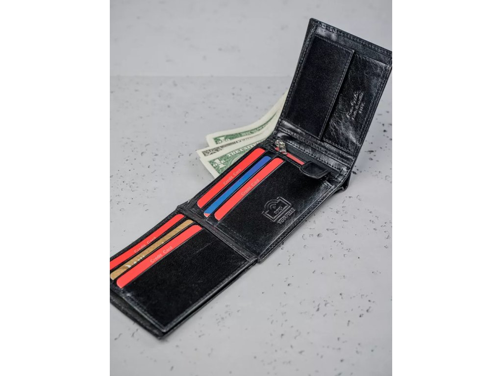 - Ohromující design | Peněženka s klasickým horizontálním designem a fantastickou povrchovou úpravou - vnější strana je potažena vrstvou, která velmi připomíná uhlíková vlákna a navíc zdobená zelenou vsadkou prošitou po celé její šířce;