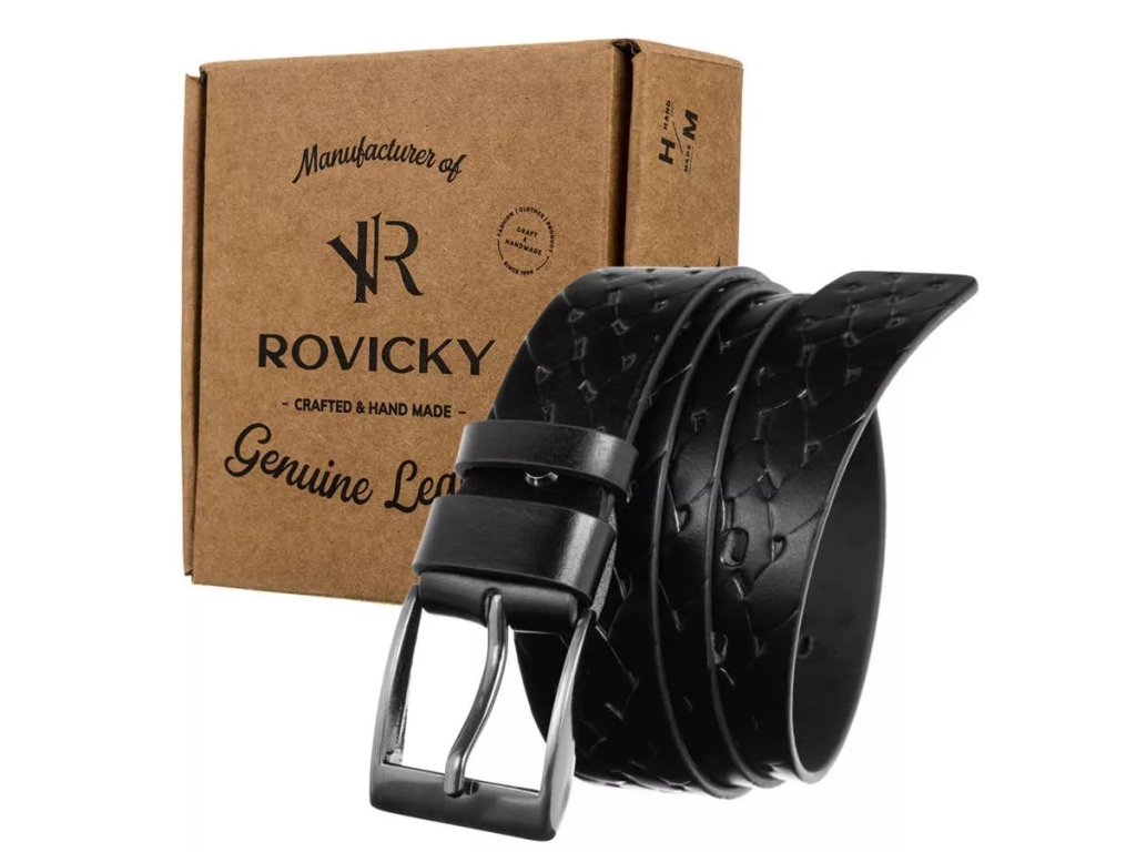 - Pánský opasek střední šířky z pravé kůže. Zdobený reliéfním vzorem připomínajícím cop, má obdélníkovou kovovou přezku a stabilizační poutko. Tento model má sedm otvorů pro nastavení obvodu.