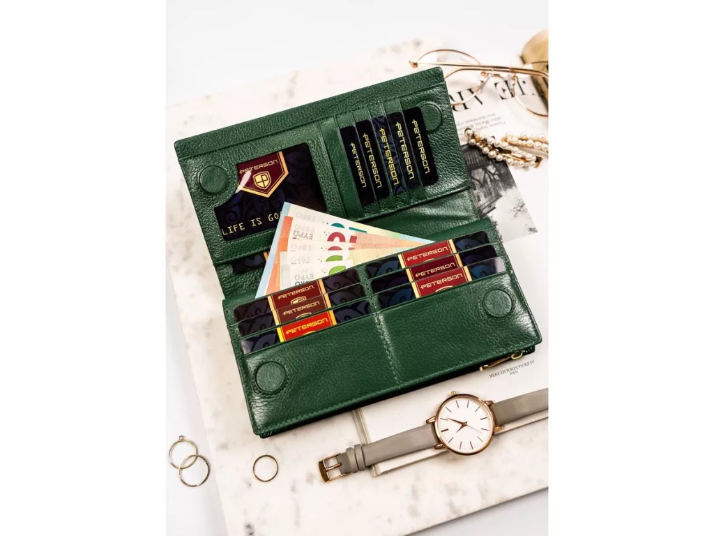 Tato elegantní dámská peněženka od Peterson je vyrobena z vysoce kvalitní pravé kůže. Má magnetické zapínání a řadu přihrádek na karty a hotovost. Je balena ve stylové krabičce – perfektní dárek.