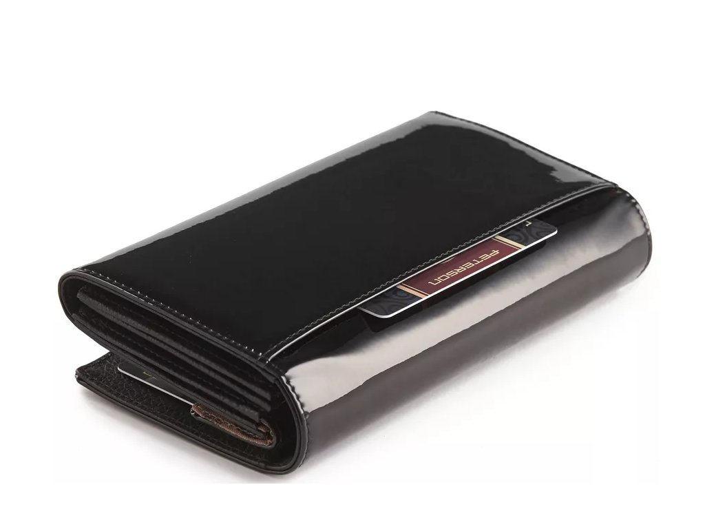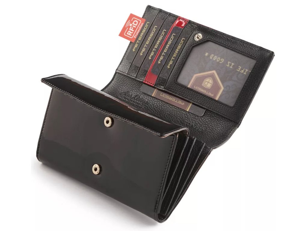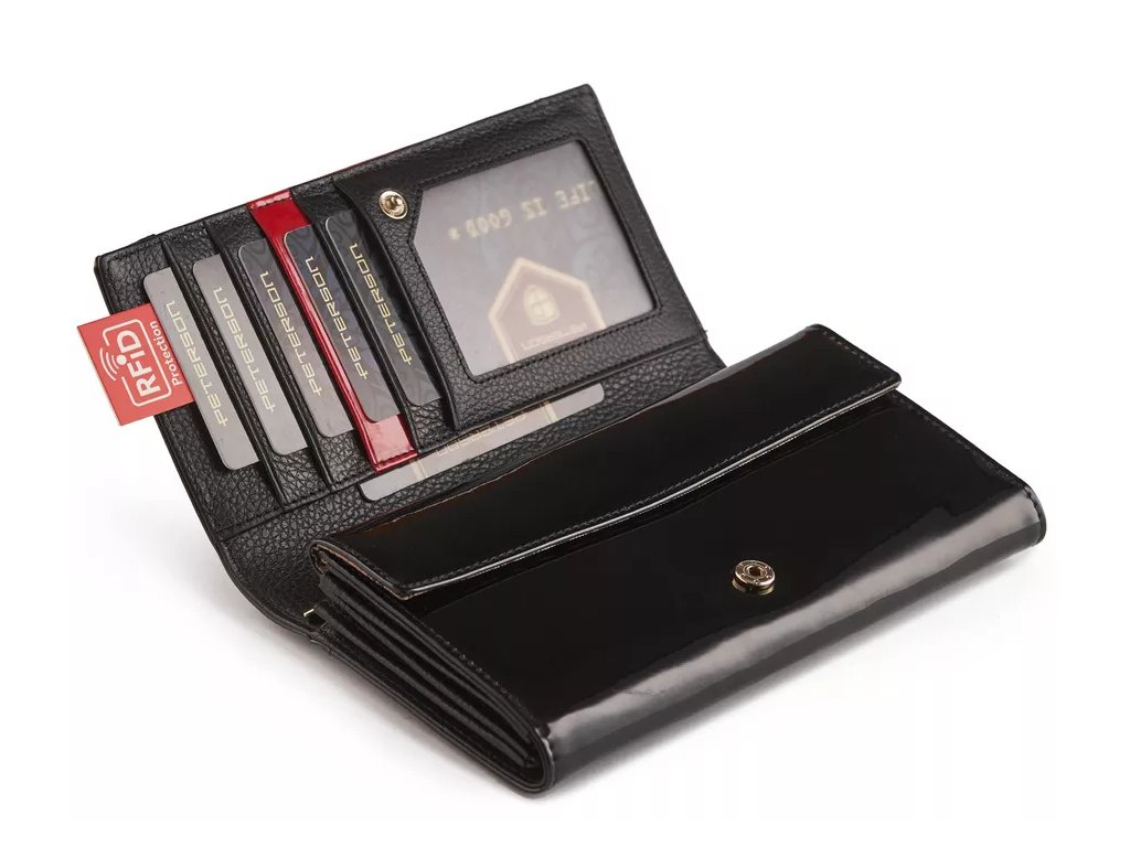 Horizontální dámská peněženka chráněná klopou s patentkou. Vyrobeno z kvalitní přírodní kůže pokryté odolným lakem. Mimořádně prostorný, kromě standardních oddílů na doklady a hotovost obsahuje přihrádku na zip a okénko na fotografie.