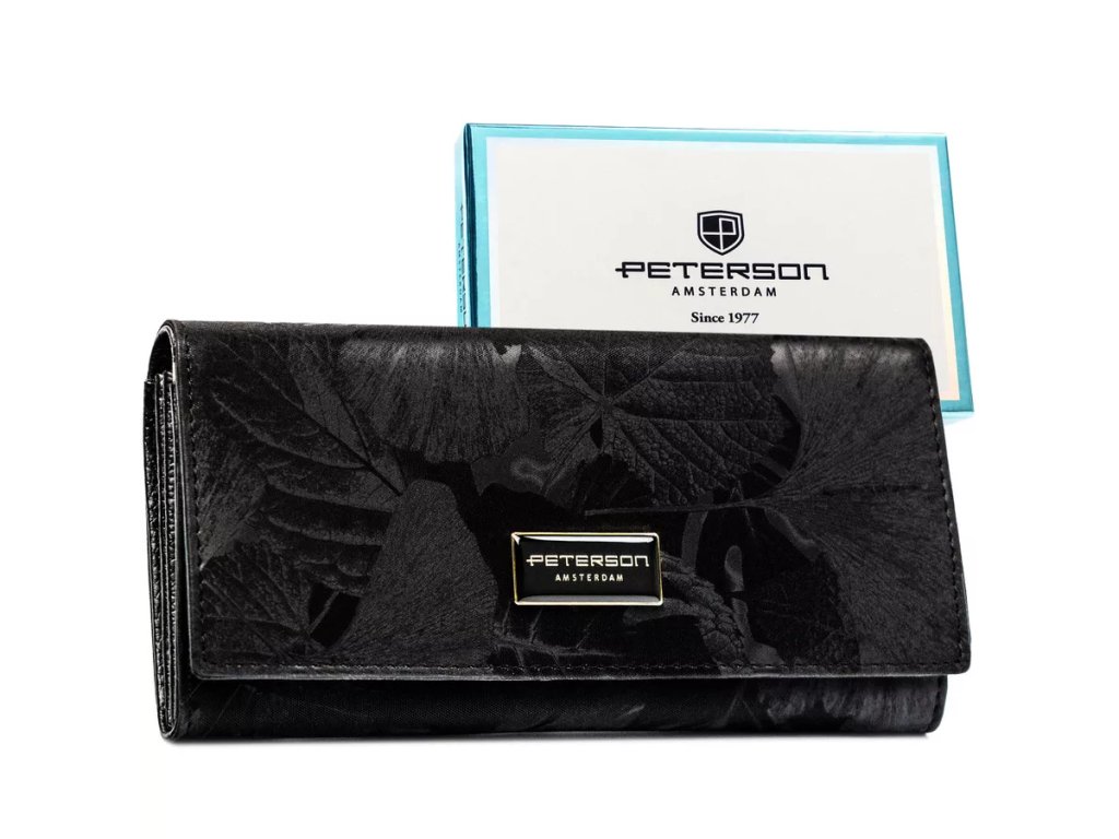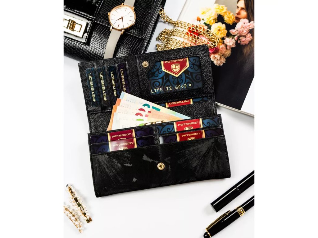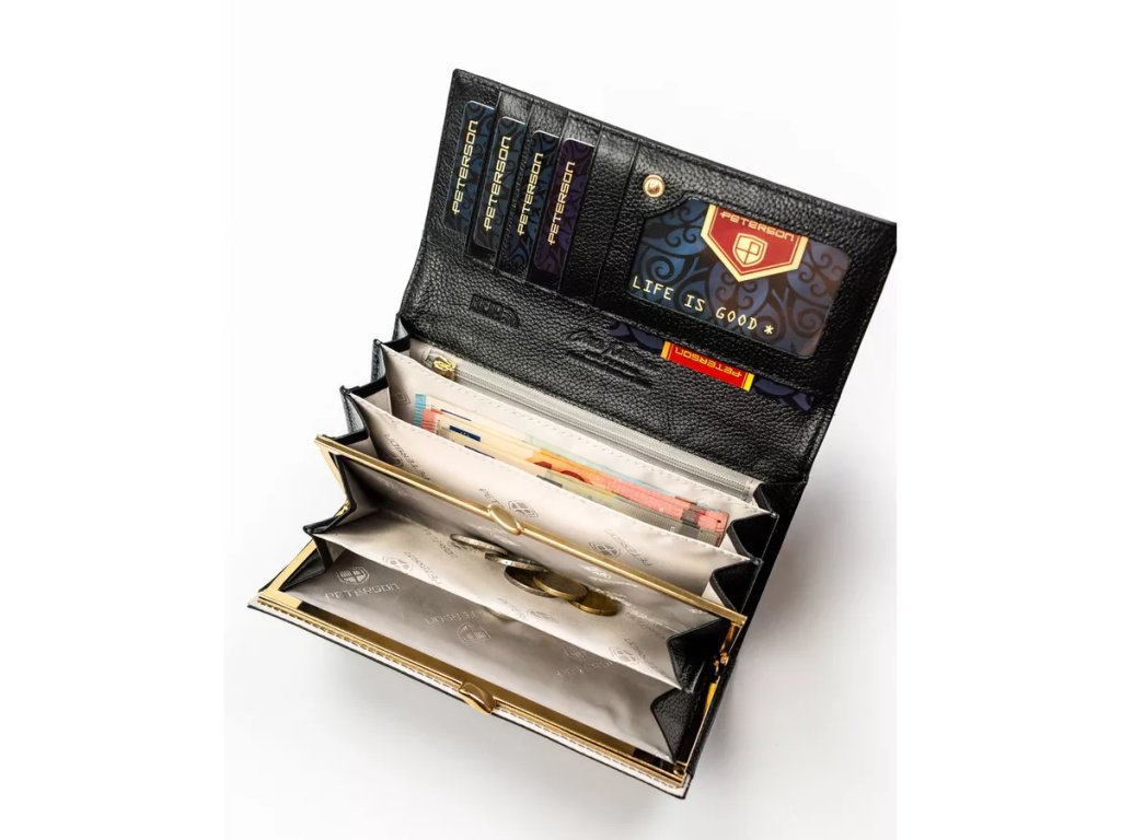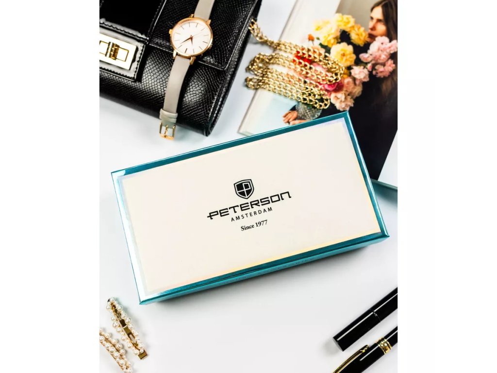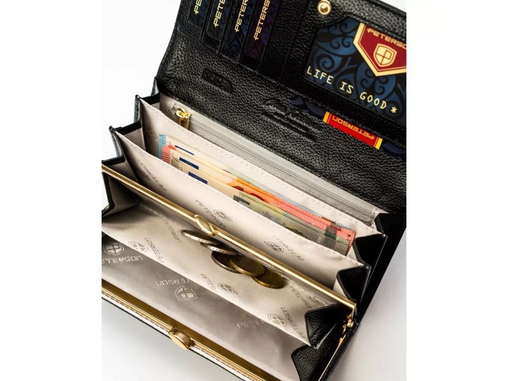 ato velká dámská peněženka od Petersonu je vyrobena z kombinace pravé a eko kůže. Pohodlný horizontální design se vyznačuje praktickou kapsou na mince se zapínáním na sponu a řadou přihrádek pro snadné uspořádání karet a dokumentů.