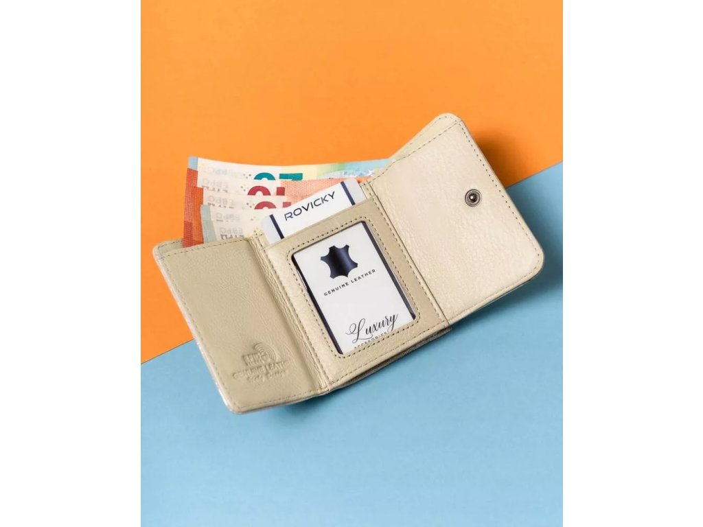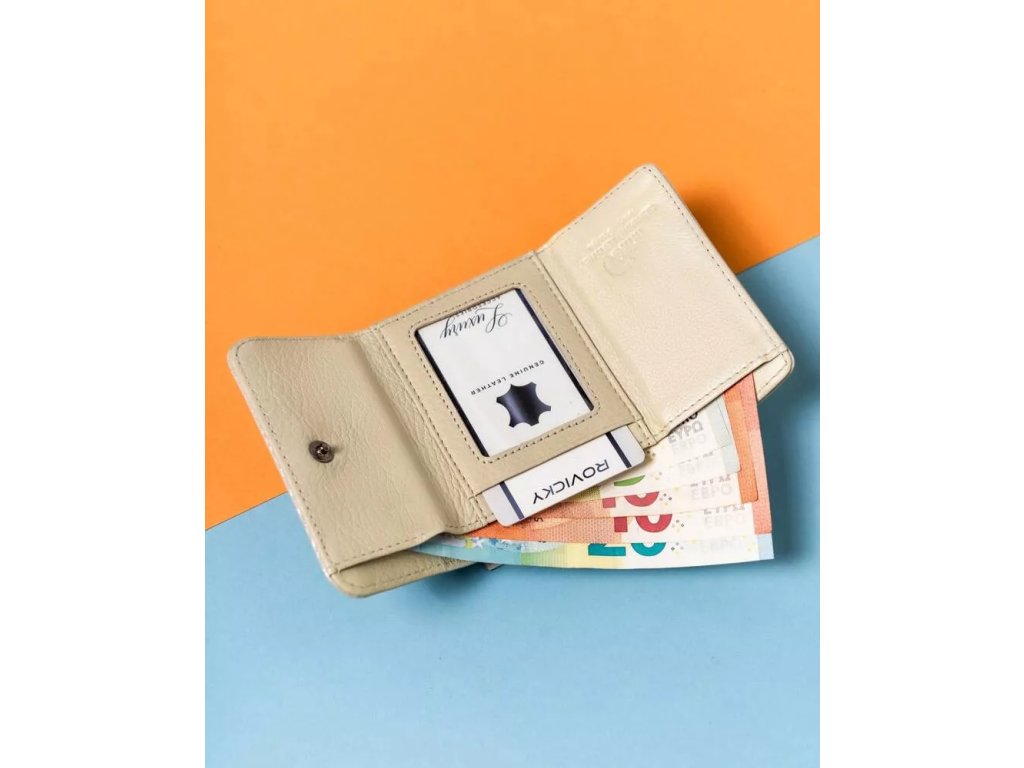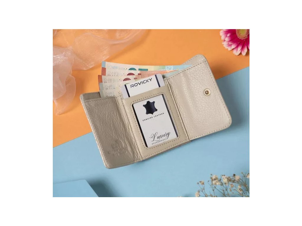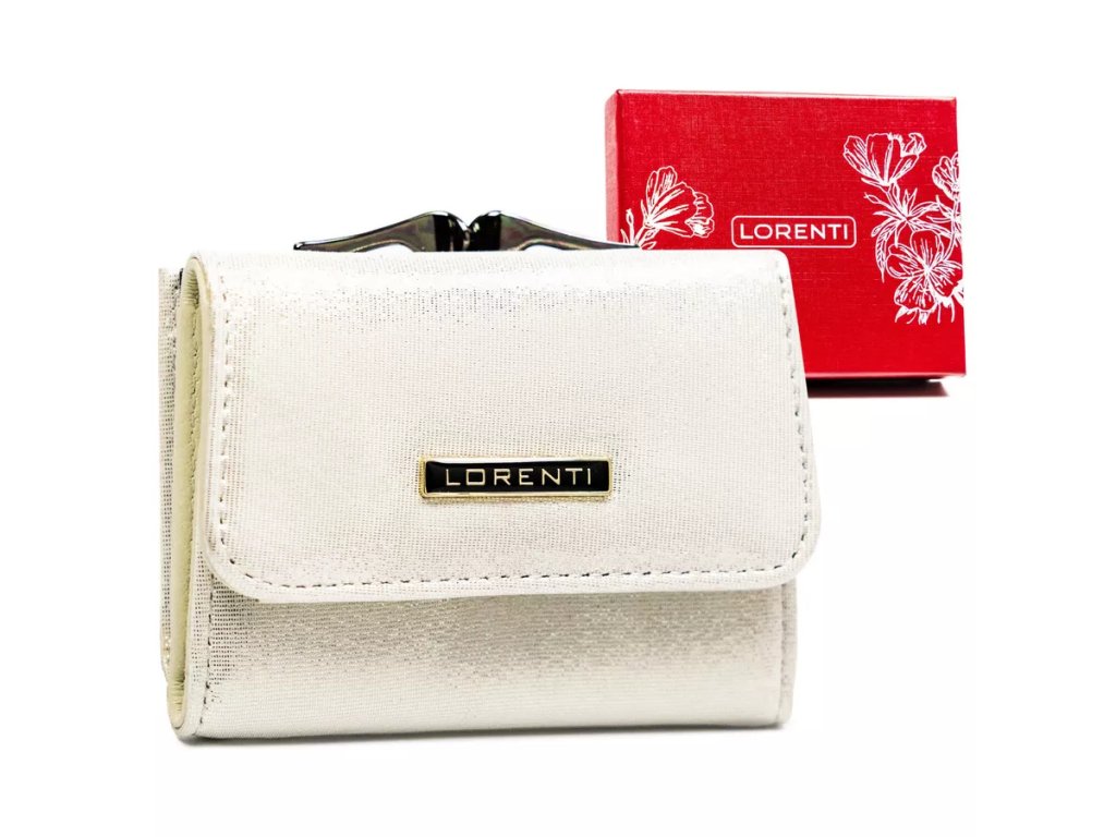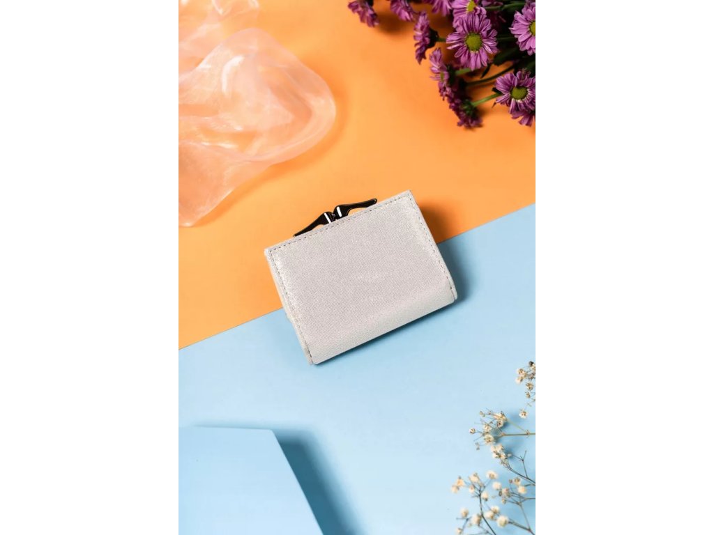 - Malá dámská peněženka zlaté barvy se zapínáním na patentku a sponou. Tento model má jednu přihrádku na bankovky, vnější kapsu na mince a průhledný slot na karty. Ochrana RFID STOP. Peněženka je balena v krabičce od výrobce.