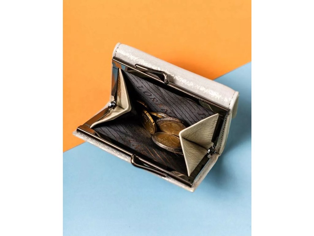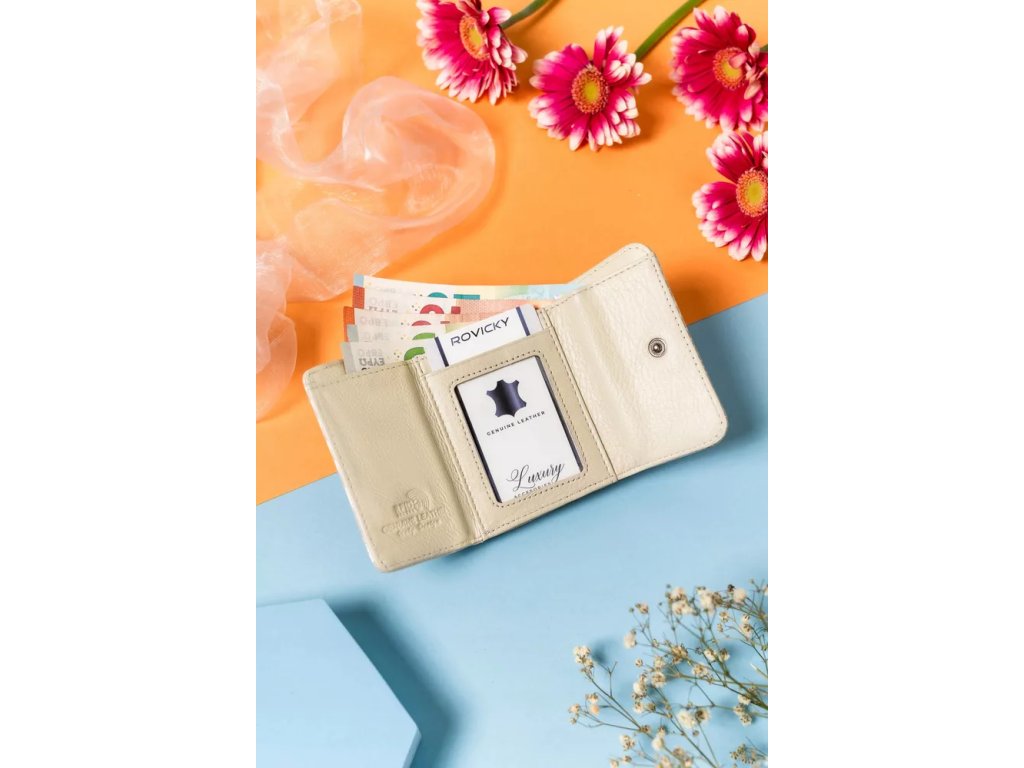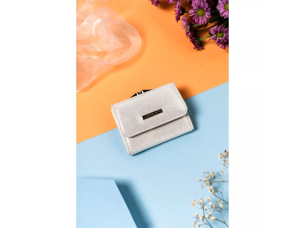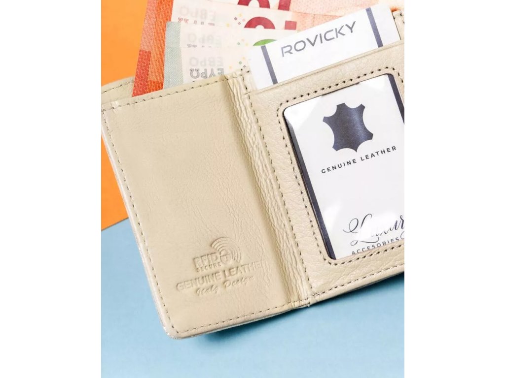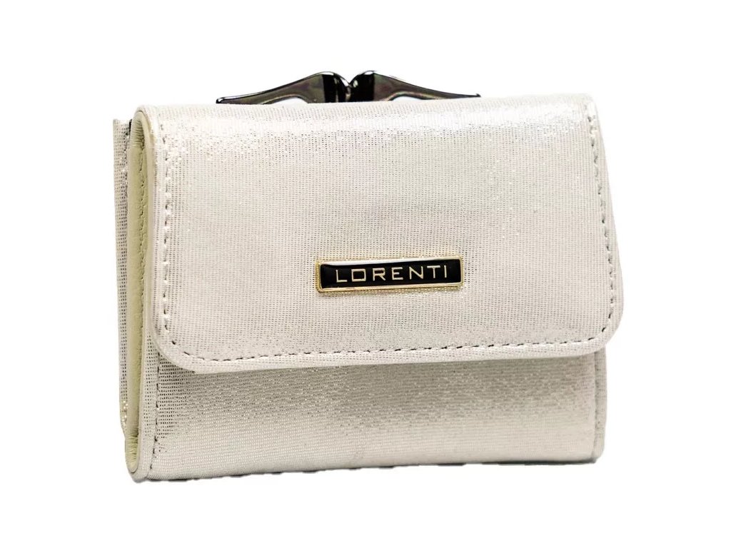 - Malá dámská peněženka zlaté barvy se zapínáním na patentku a sponou. Tento model má jednu přihrádku na bankovky, vnější kapsu na mince a průhledný slot na karty. Ochrana RFID STOP. Peněženka je balena v krabičce od výrobce.