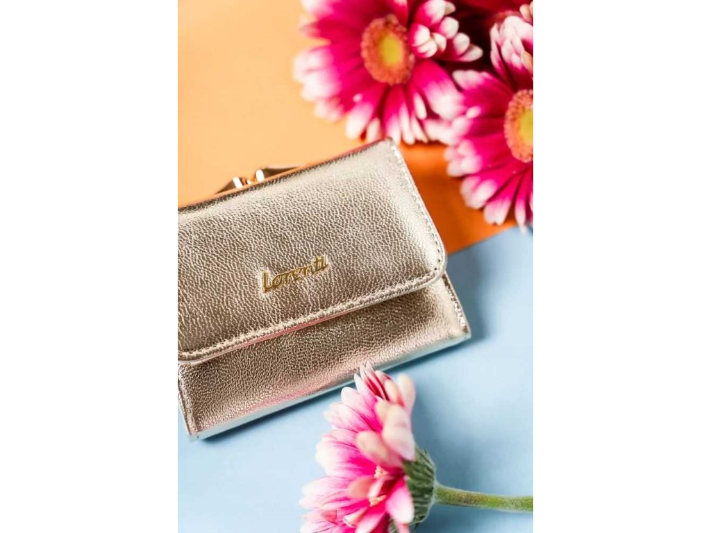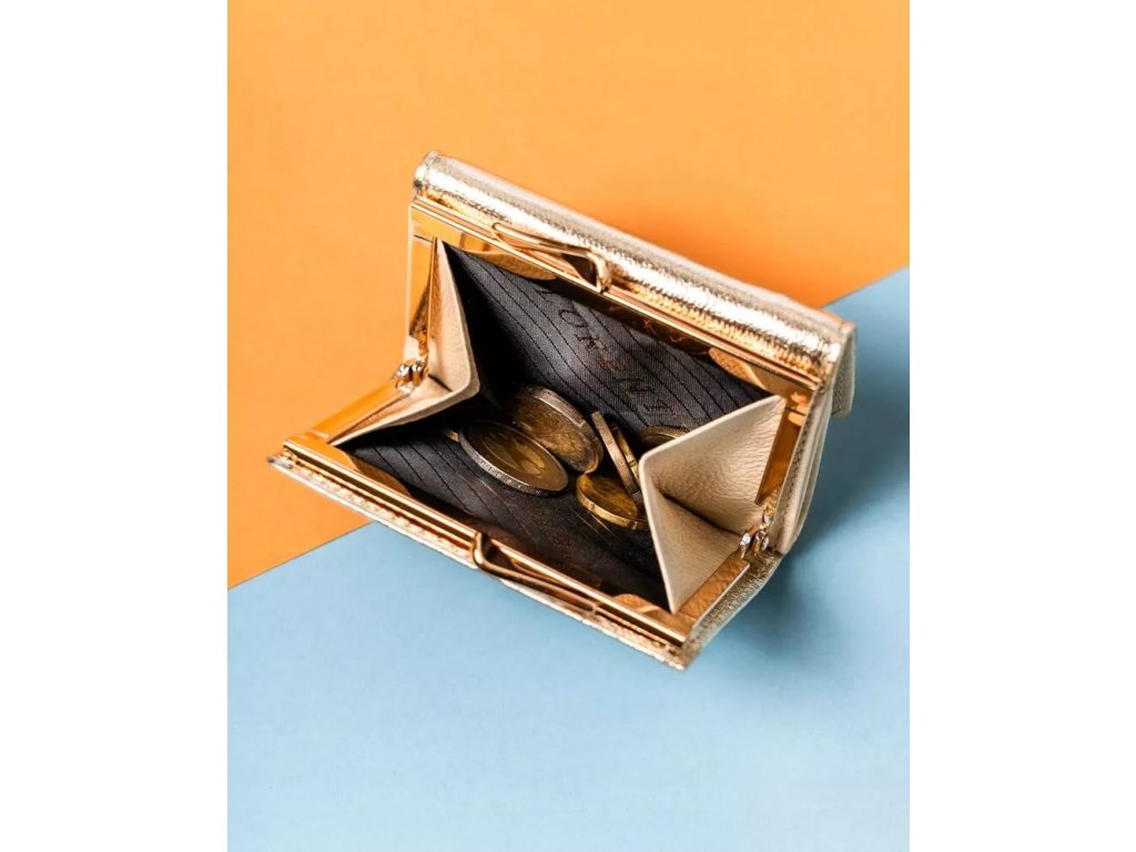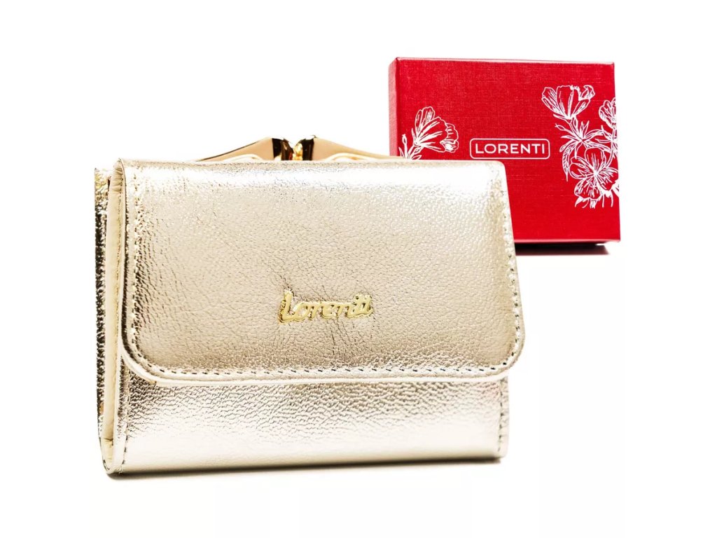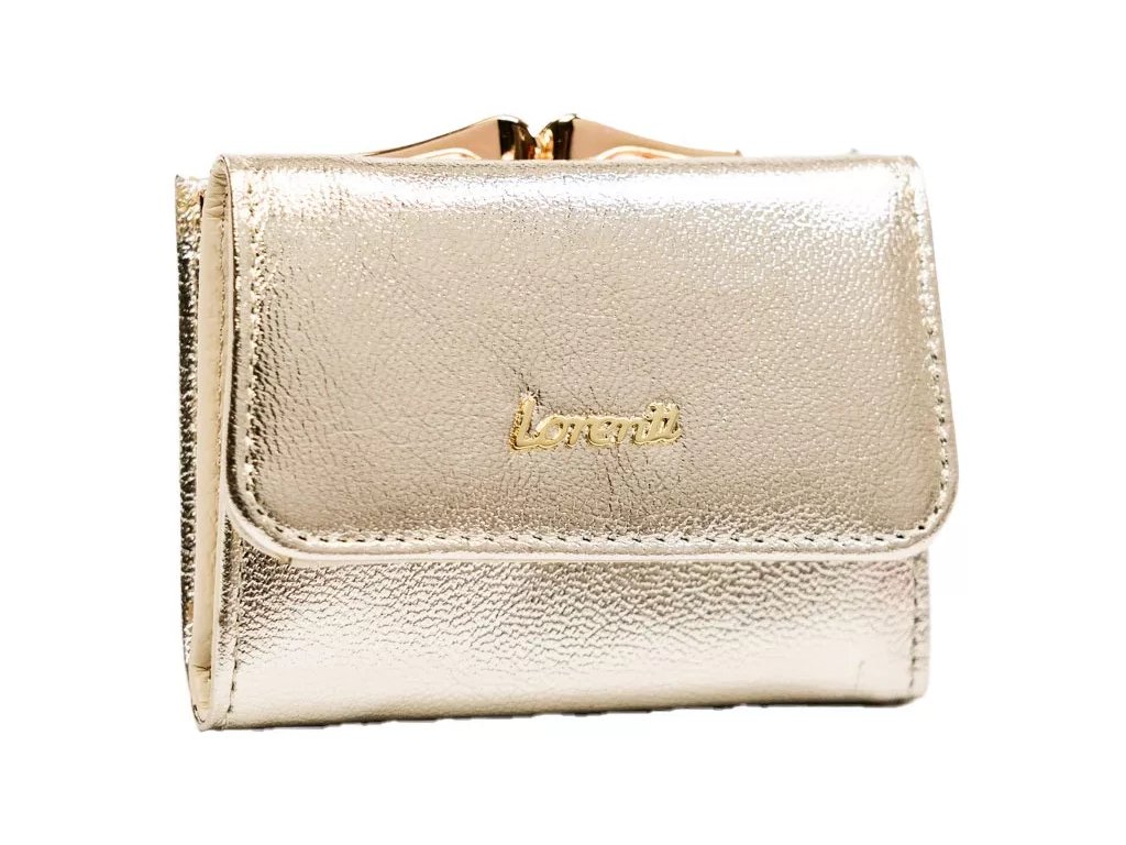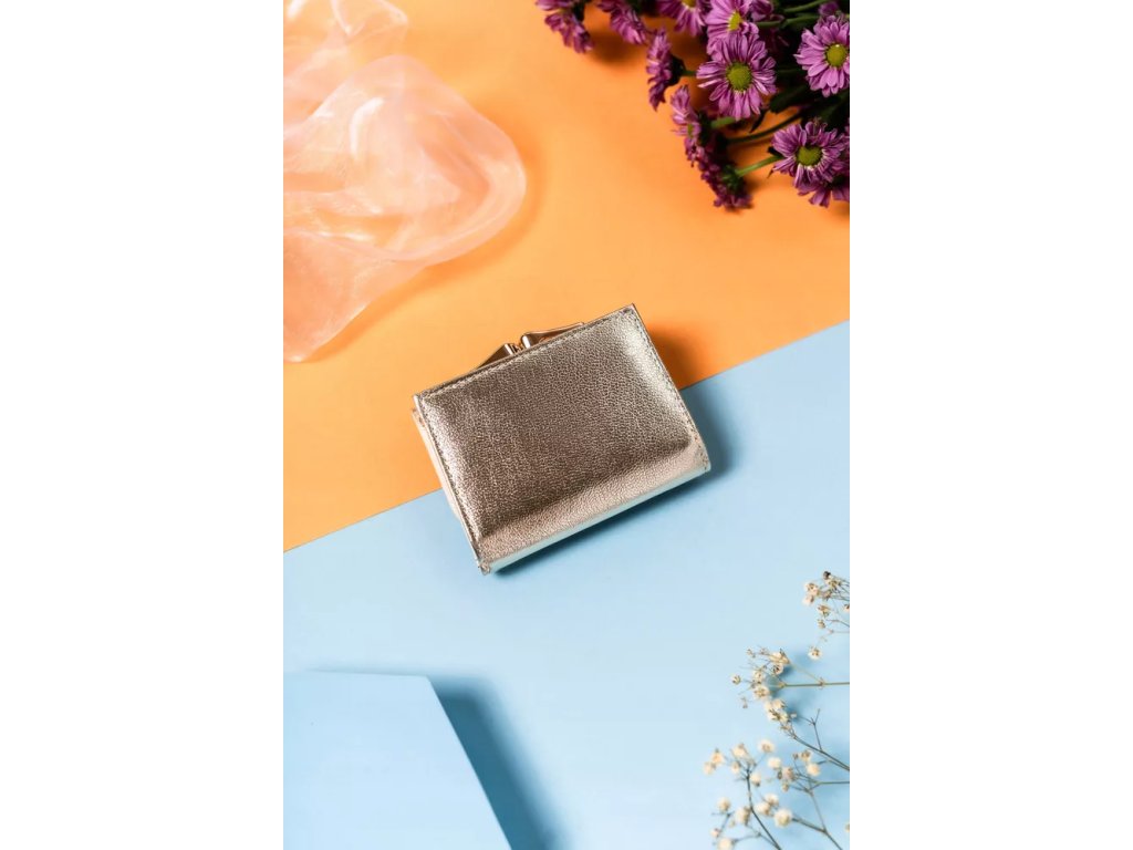 - Malá kožená peněženka ve zlaté barvě pro ženy. Peněženka má přihrádku na bankovky, vnější kapsu na mince se zapínáním na sponu a průhledný slot na karty. RFID-STOP membrána. Baleno v dárkové krabičce.