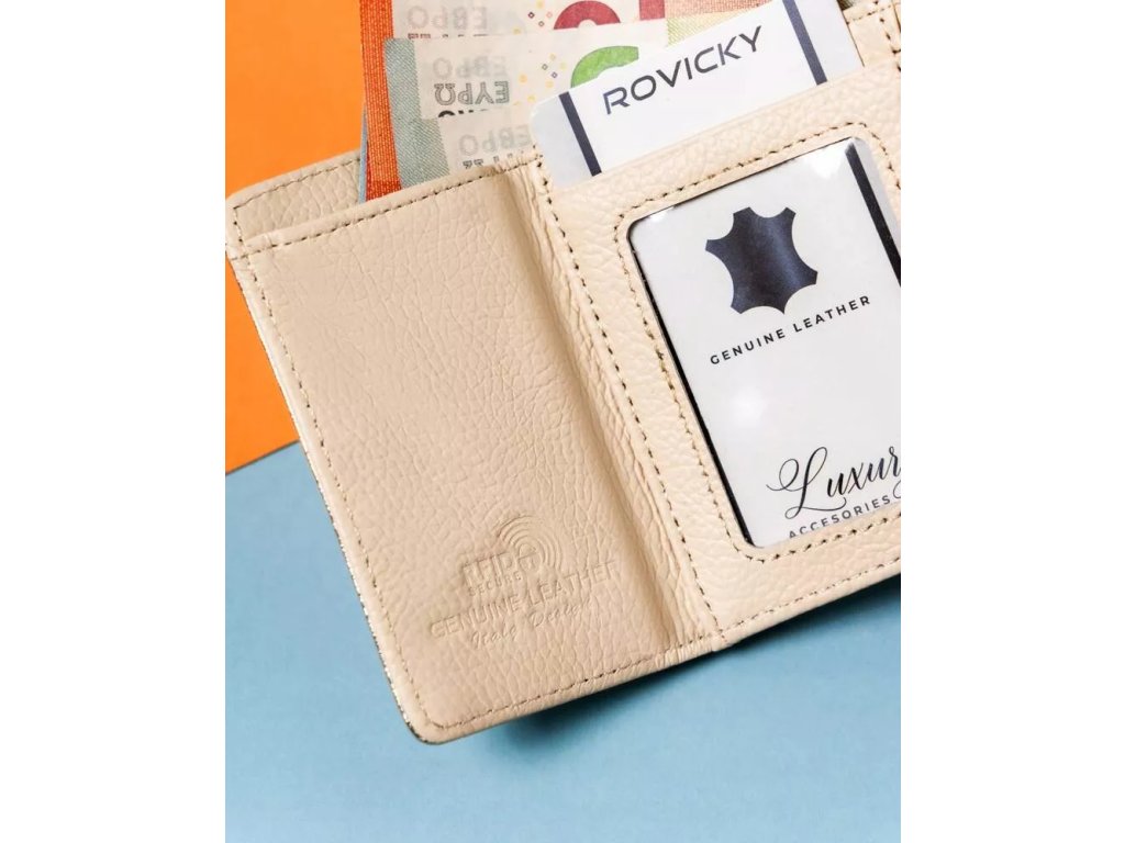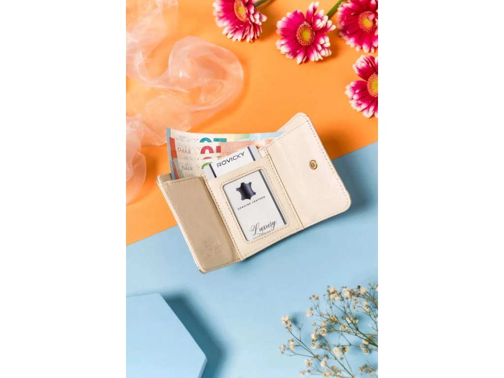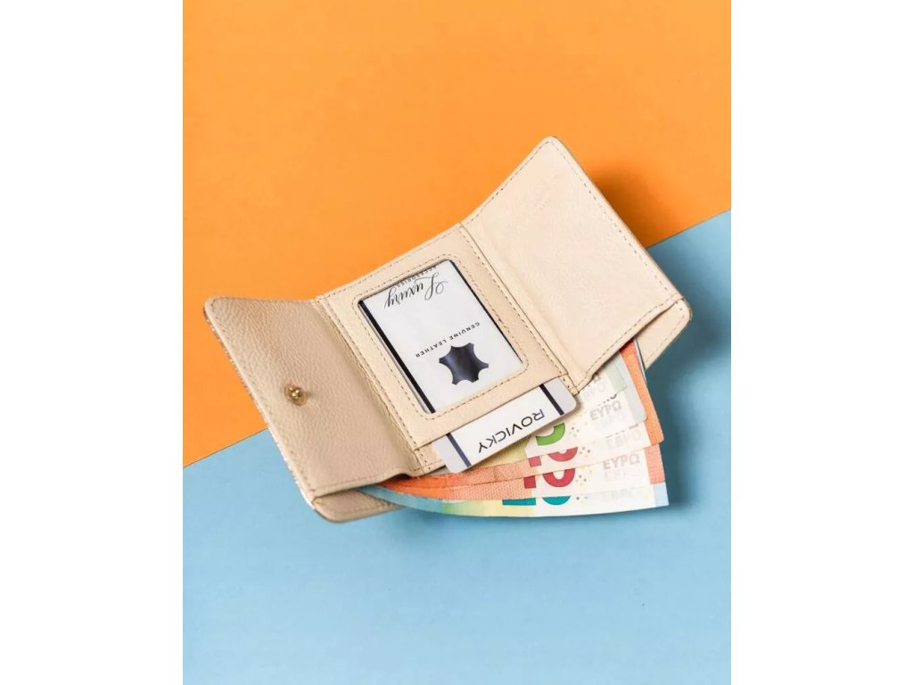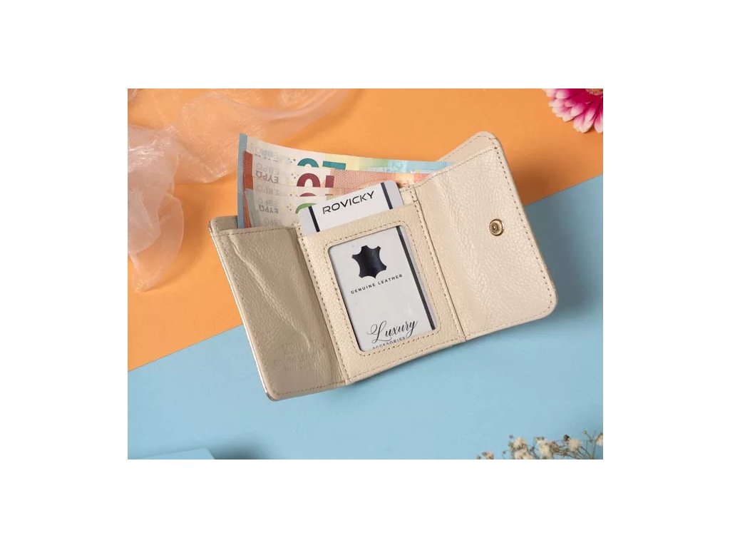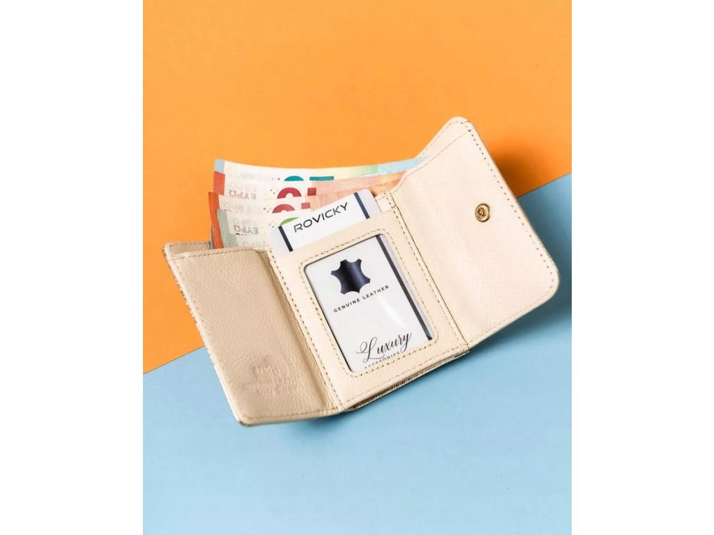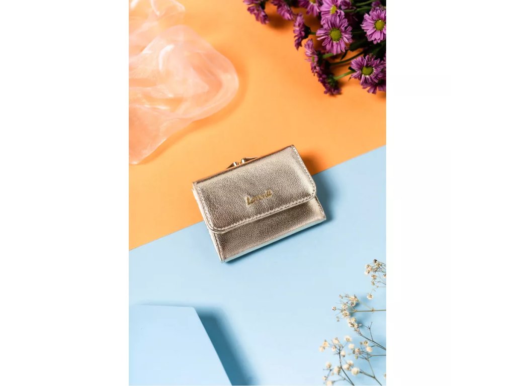 - Malá kožená peněženka ve zlaté barvě pro ženy. Peněženka má přihrádku na bankovky, vnější kapsu na mince se zapínáním na sponu a průhledný slot na karty. RFID-STOP membrána. Baleno v dárkové krabičce.