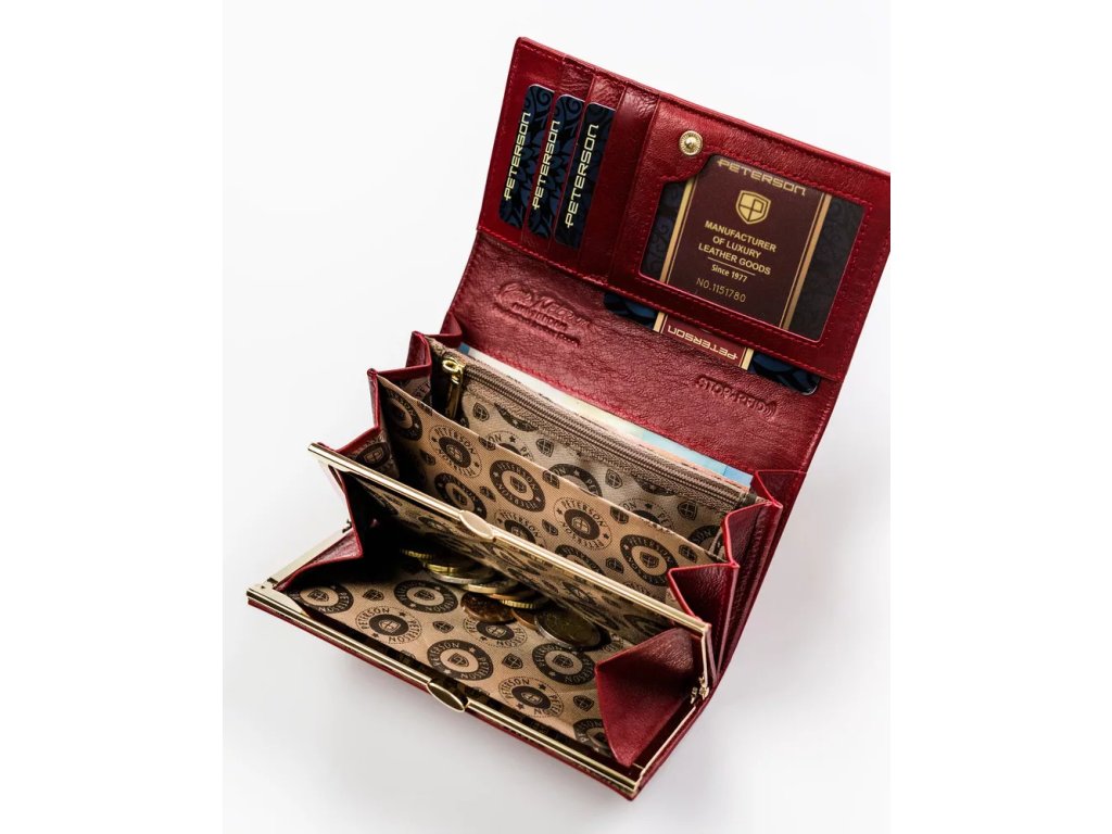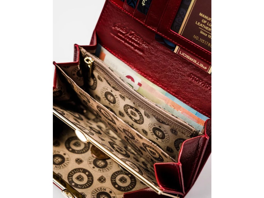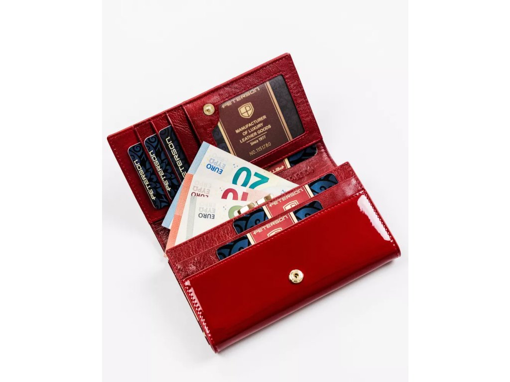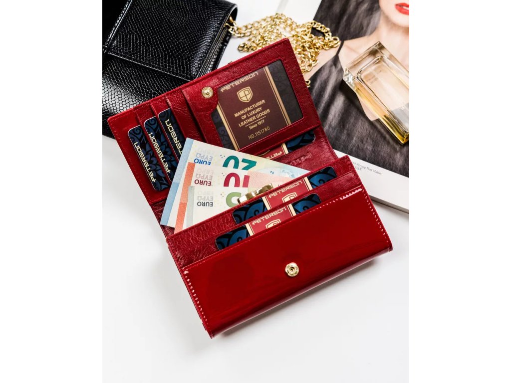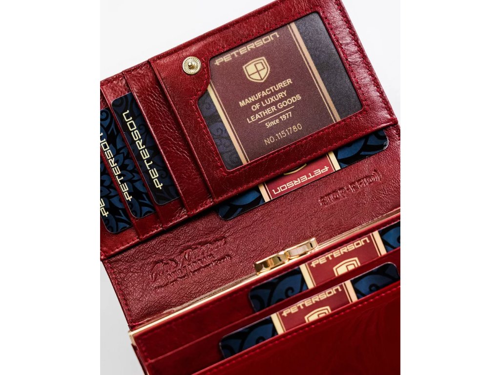 - Dámská kožená peněženka Peterson s kapsou na zapínání. Výrazný design, který kombinuje eleganci s funkčností. Ideální volba pro ženy, které hledají stylovou a kvalitní peněženku.
