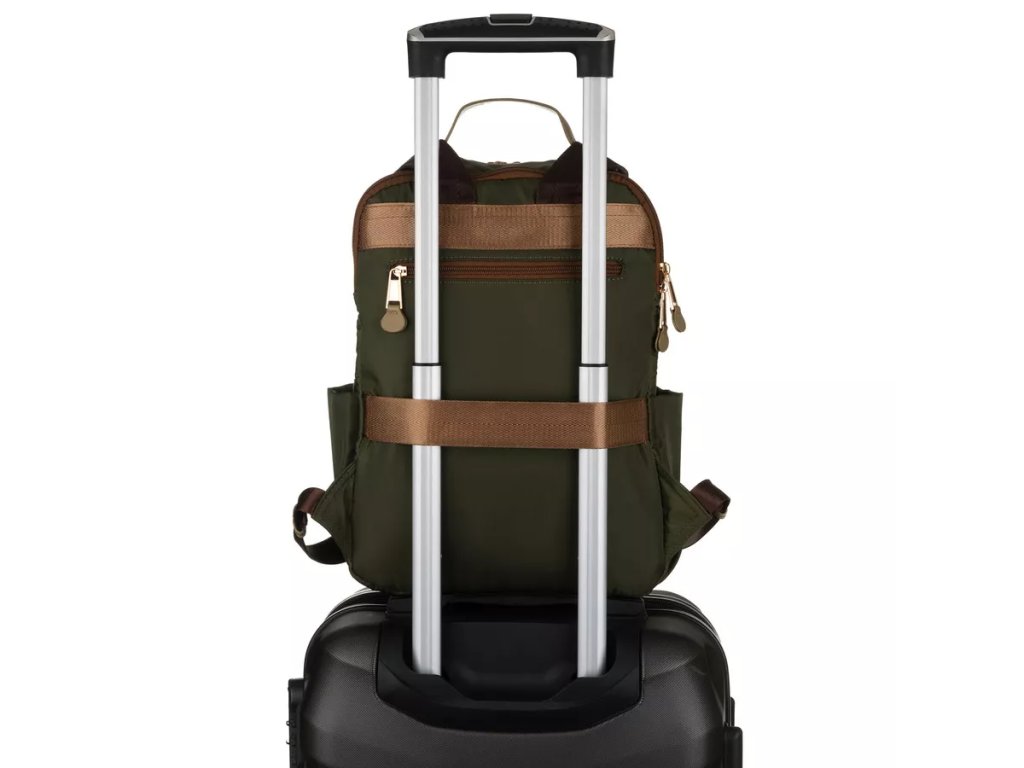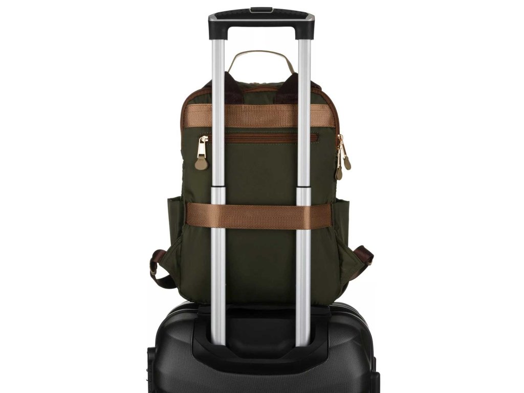 Pás k uchycení na rukojeť kufru: Praktický pás na zadní straně batohu umožňuje snadné připevnění na rukojeť kufru, což je výhodné při cestování a usnadňuje manipulaci s batohem na letišti nebo při přesunech.
