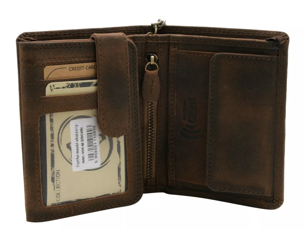 Vertikální pánská peněženka z nubukové kůže s reliéfním motivem a řetízkem