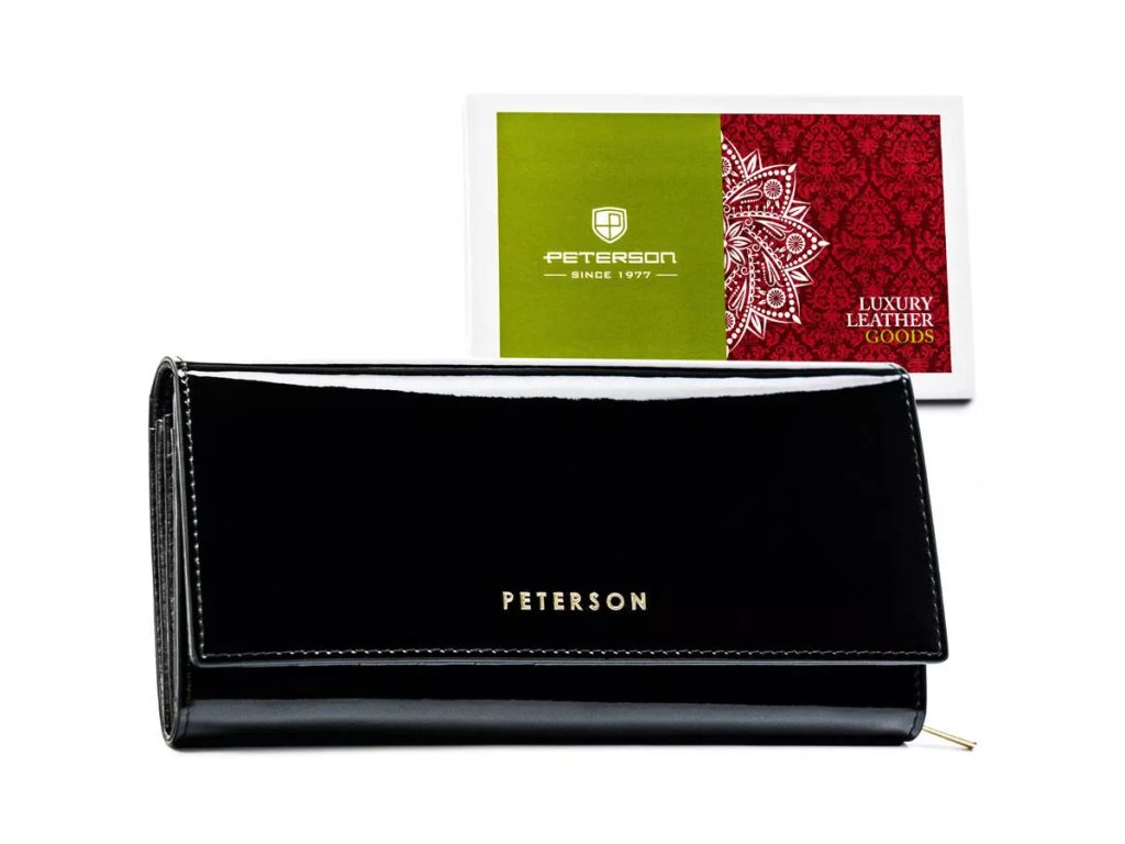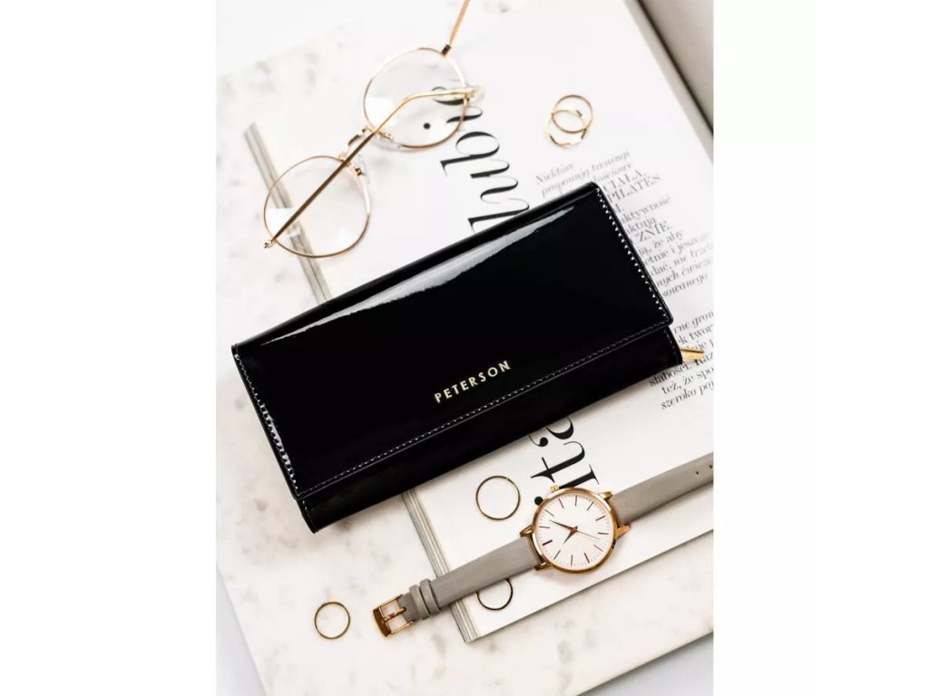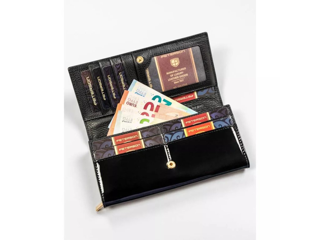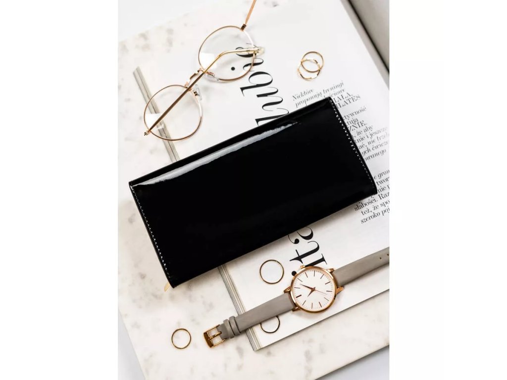 Horizontální dámská peněženka chráněná klopou s patentkou. Vyrobeno z kvalitní přírodní kůže pokryté odolným lakem. Mimořádně prostorný, kromě standardních oddílů na doklady a hotovost obsahuje přihrádku na zip a okénko na fotografie.