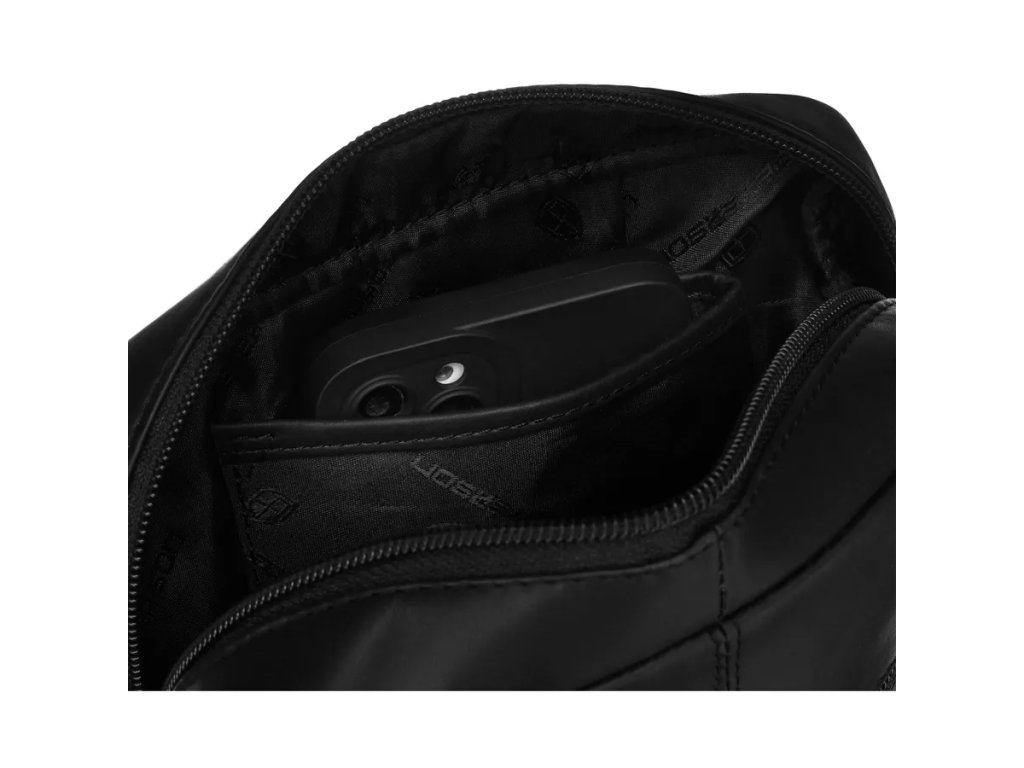 Jednokomorová messenger taška uzavíraná na zip, vybavená přední a zadní kapsou na zip.