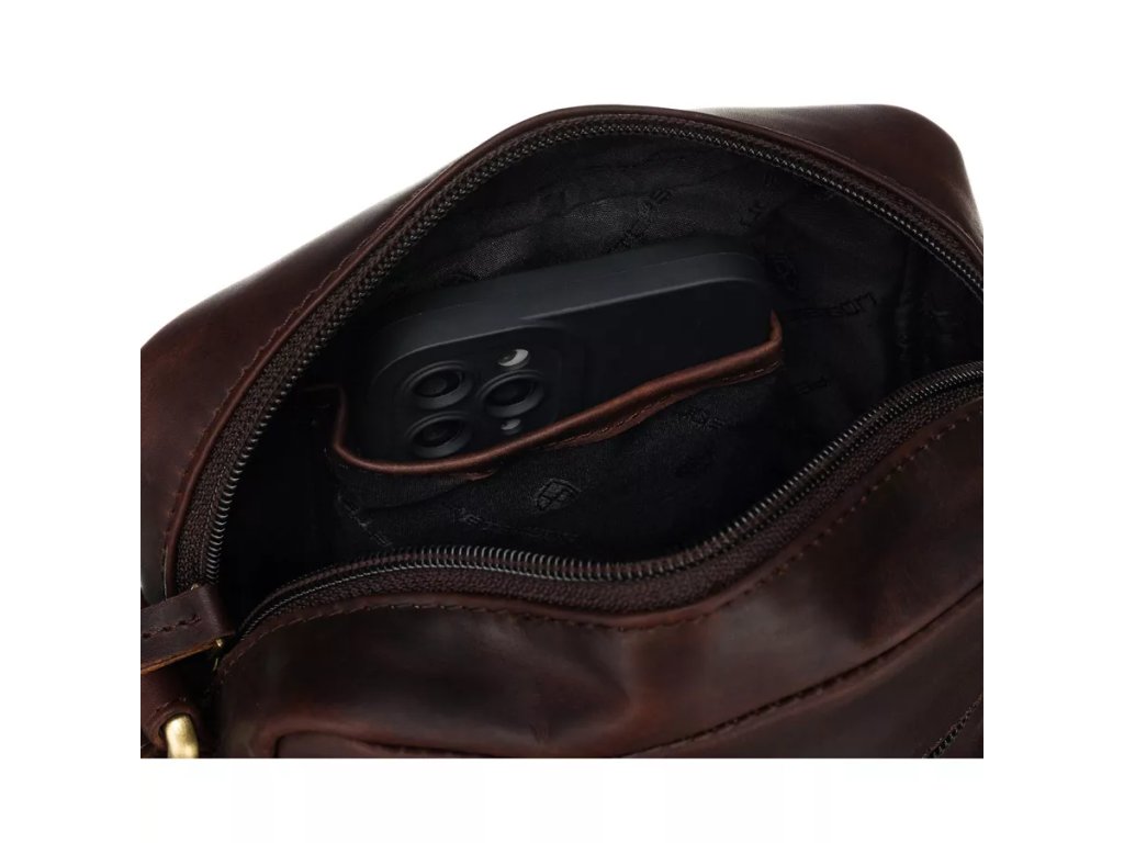 Jednokomorový sáček uzavíratelný na zip. Přihrádka obsahuje 1 kapsu na zip a 1 kapsu na telefon potaženou přírodní kůží.