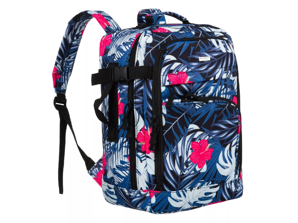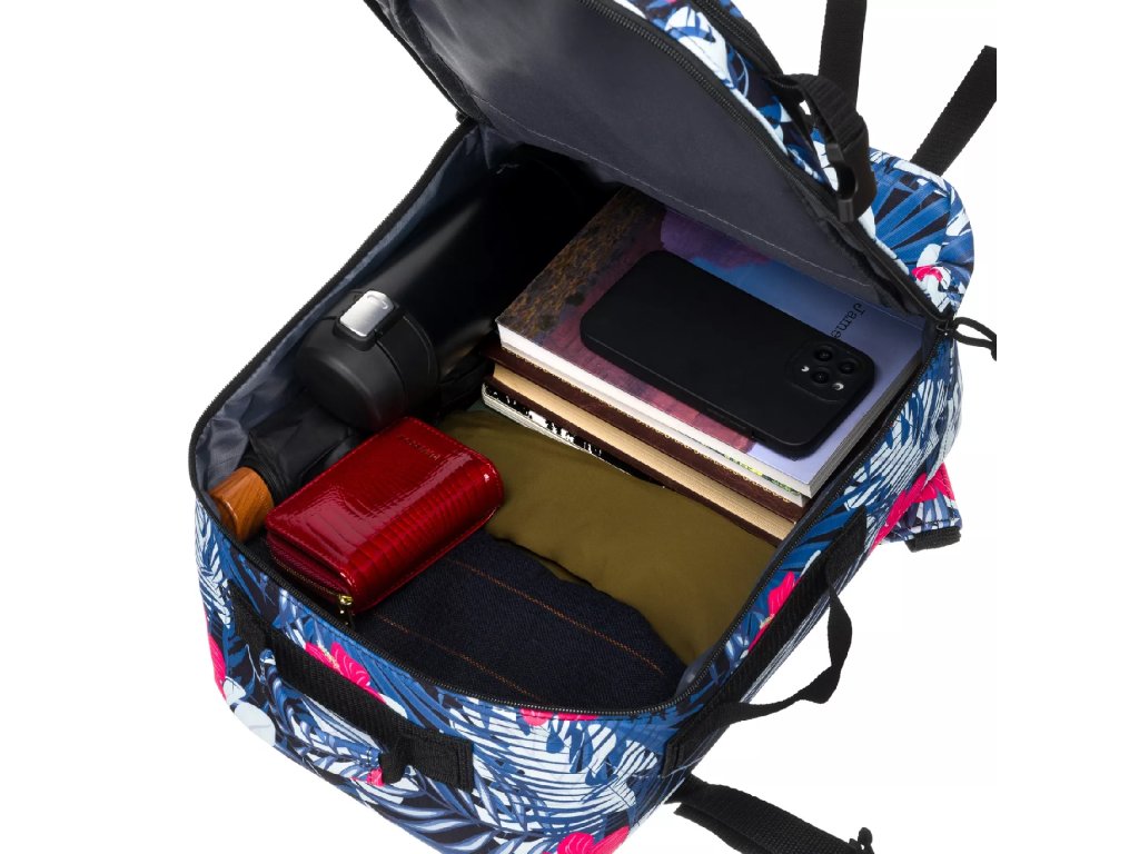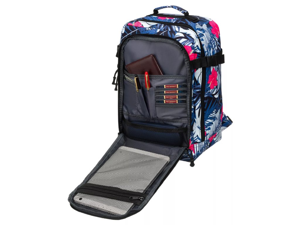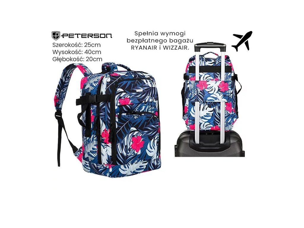 Batoh má nastavitelné výztuhy a pásek, který vám umožní připevnit batoh k výsuvné rukojeti kufru, což vám usnadní cestování. Textilní rukojeť pro přenášení batohu. Batoh má velký hlavní kapsu a přední kapsu. Batoh se otevírá zipem.