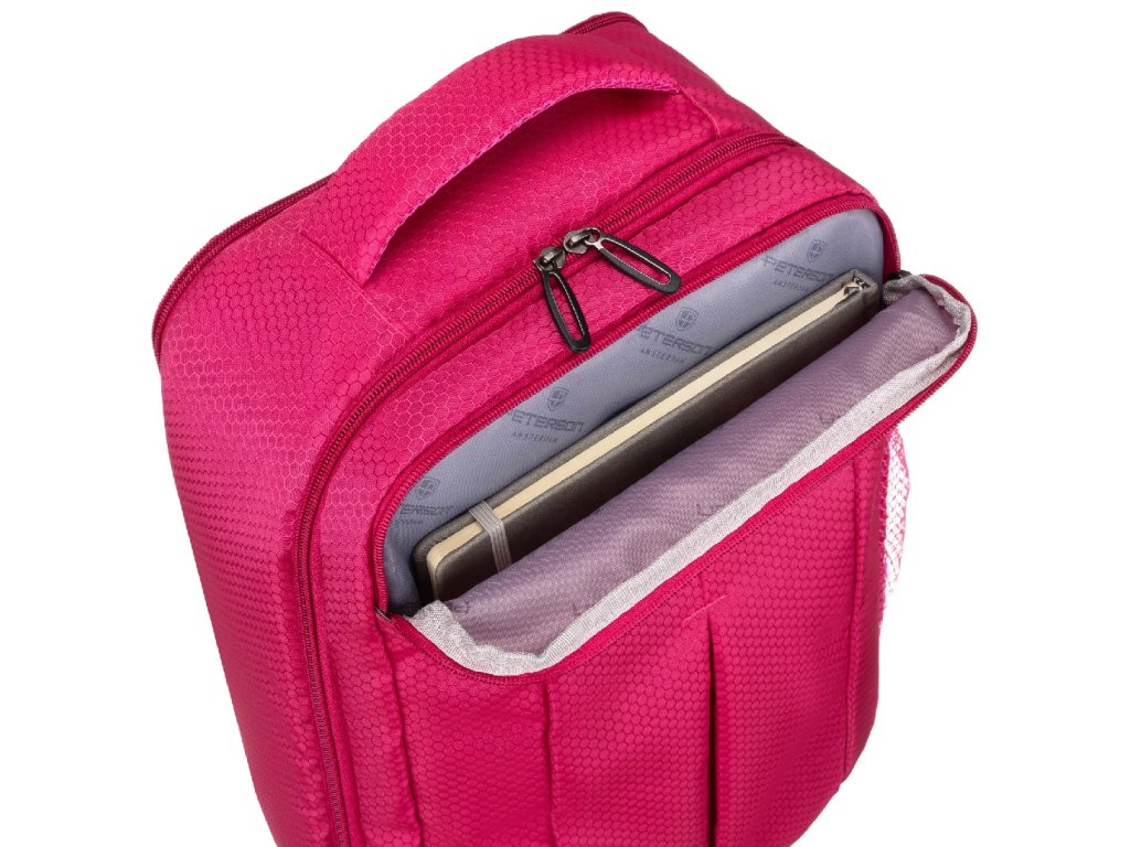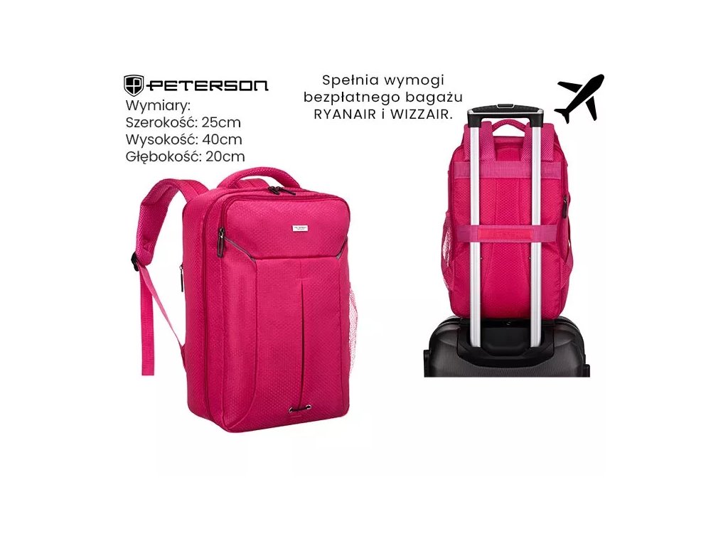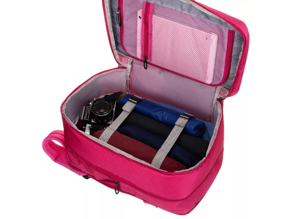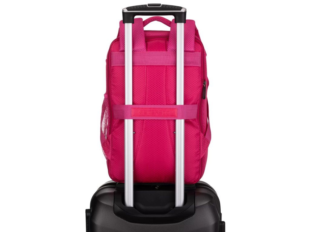 Batoh má nastavitelné výztuhy a pásek, který vám umožní připevnit batoh k výsuvné rukojeti kufru, což vám usnadní cestování. Textilní rukojeť pro přenášení batohu. Batoh má velký hlavní kapsu a přední kapsu. Batoh se otevírá zipem.