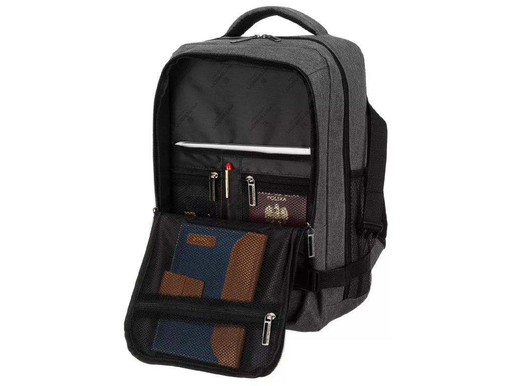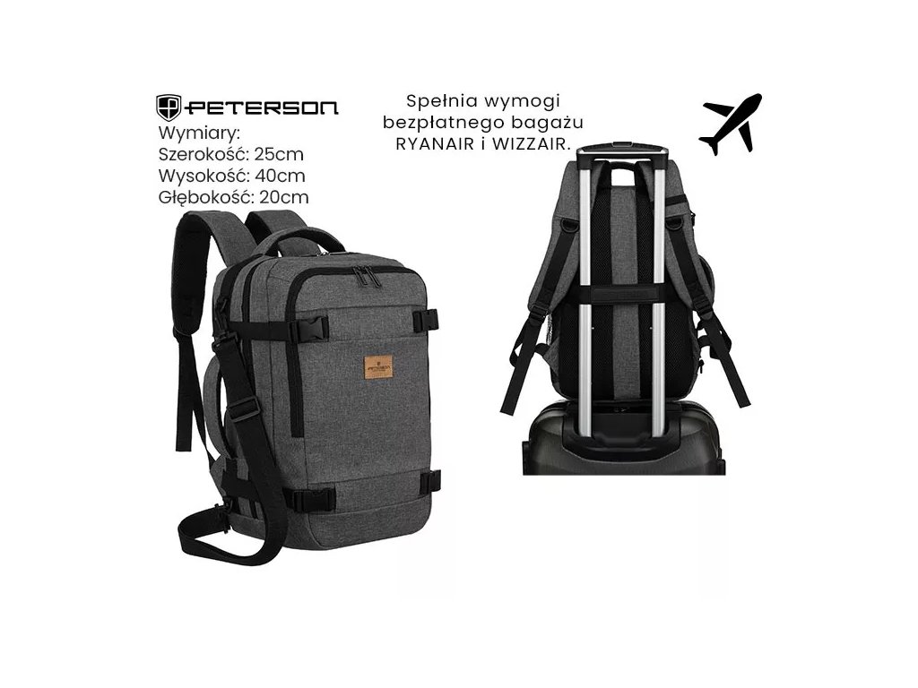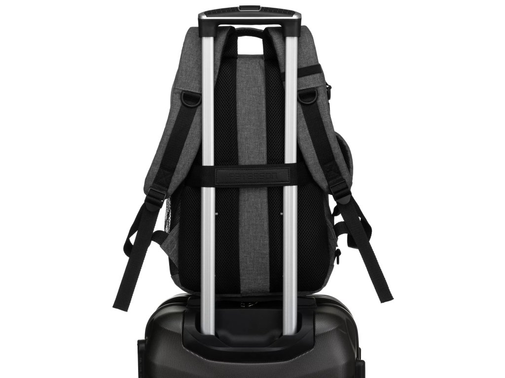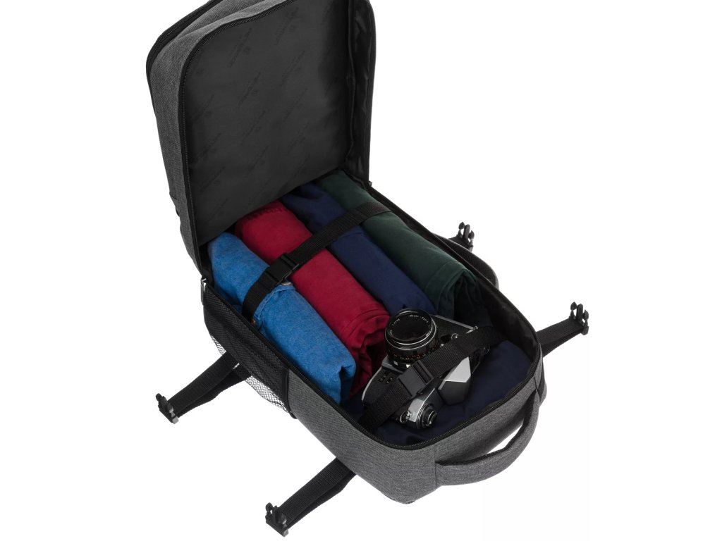 Batoh má nastavitelné výztuhy a pásek, který vám umožní připevnit batoh k výsuvné rukojeti kufru, což vám usnadní cestování. Textilní rukojeť pro přenášení batohu. Batoh má velký hlavní kapsu a přední kapsu. Batoh se otevírá zipem.
