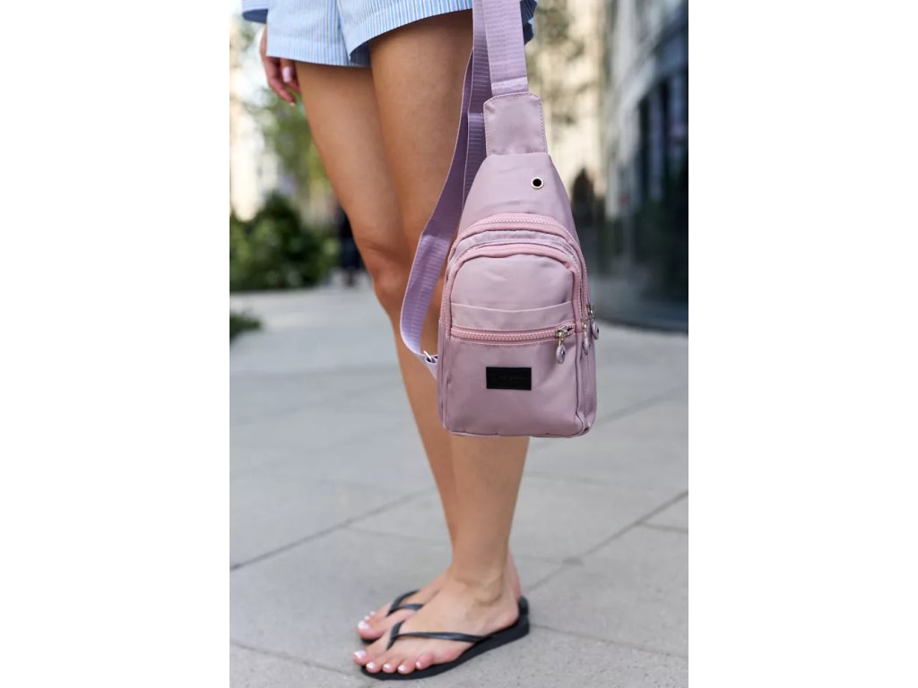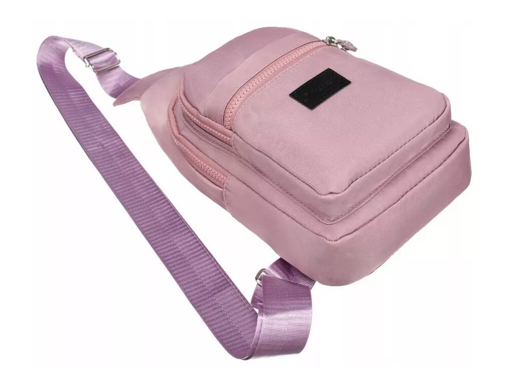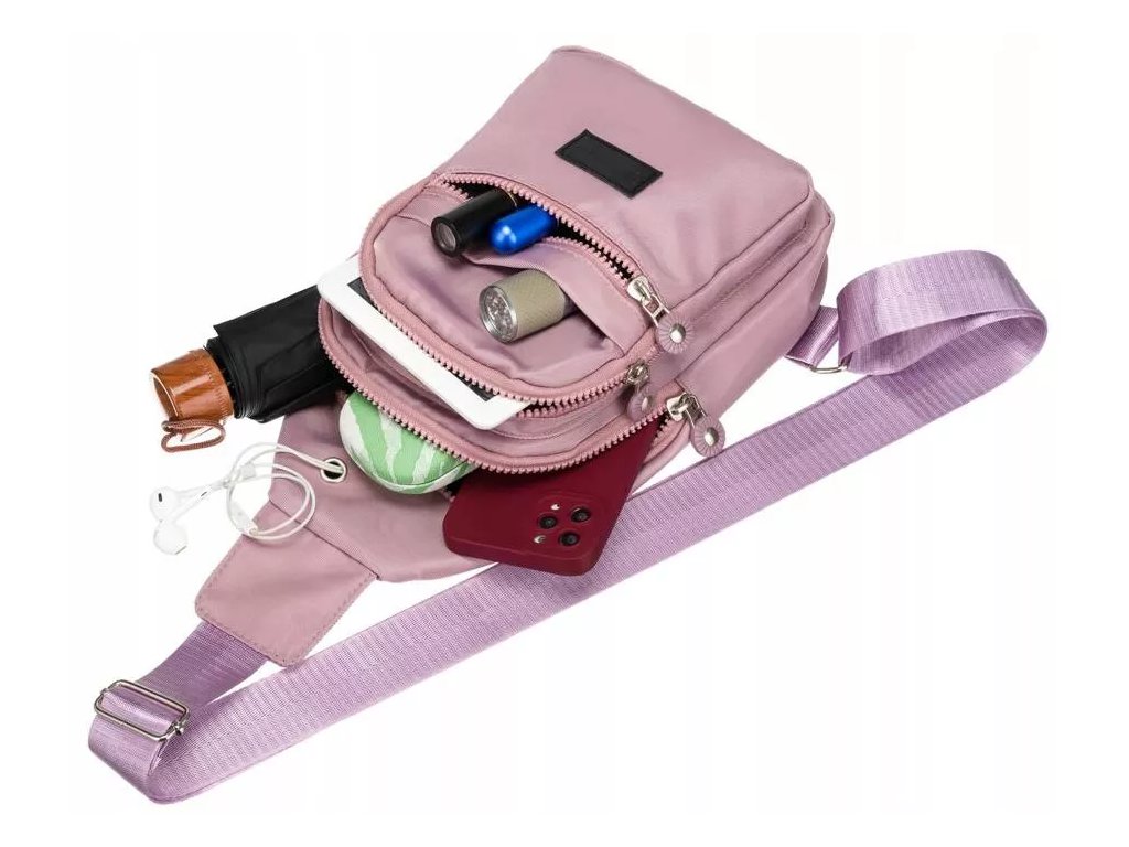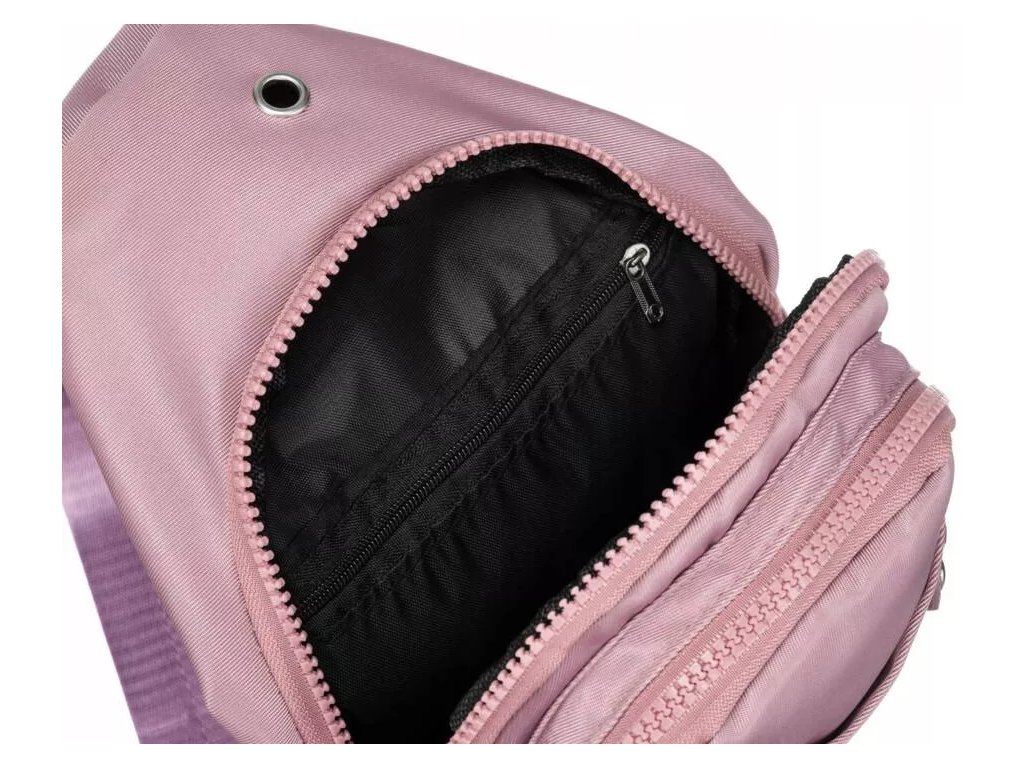 Taška je zavěšena na 3,5 cm širokém popruhu s nastavitelnou délkou (74-140 cm).