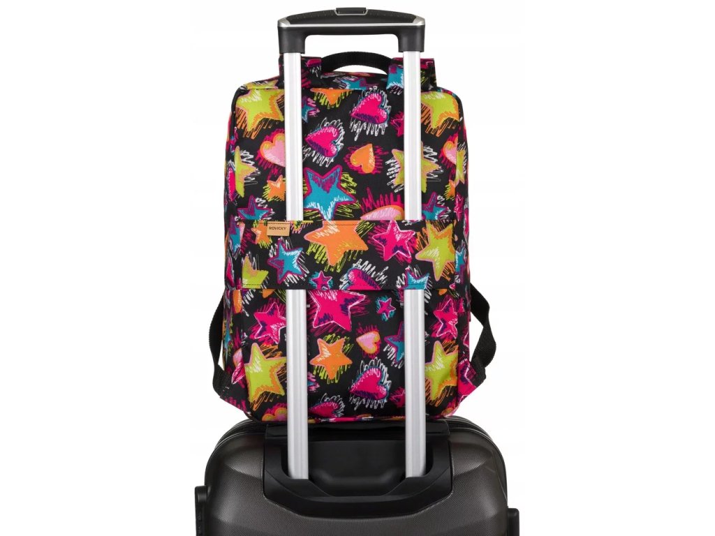 Batoh má nastavitelné výztuhy a pásek, který vám umožní připevnit batoh k výsuvné rukojeti kufru, což vám usnadní cestování. Textilní rukojeť pro přenášení batohu. Batoh má velký hlavní kapsu a přední kapsu. Batoh se otevírá zipem.