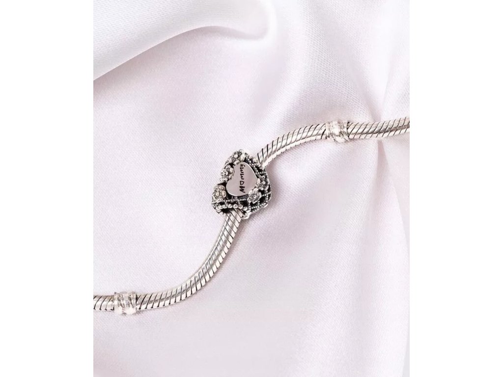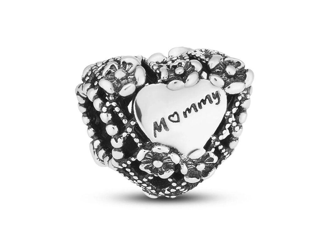 Tento jedinečný přívěsek má tvar prolamovaného srdce s detaily připomínajícími složitou krajku, které mu dodávají romantický nádech. V srdci je vyzdoben jemný nápis „Mommy“ (Maminka) , který je poctou zvláštnímu poutu mezi matkou a dítětem. Nápis je obklopen květinovými vzory a vytváří tak kompozici připomínající rozkvetlou zahradu překypující láskou a vděčností.