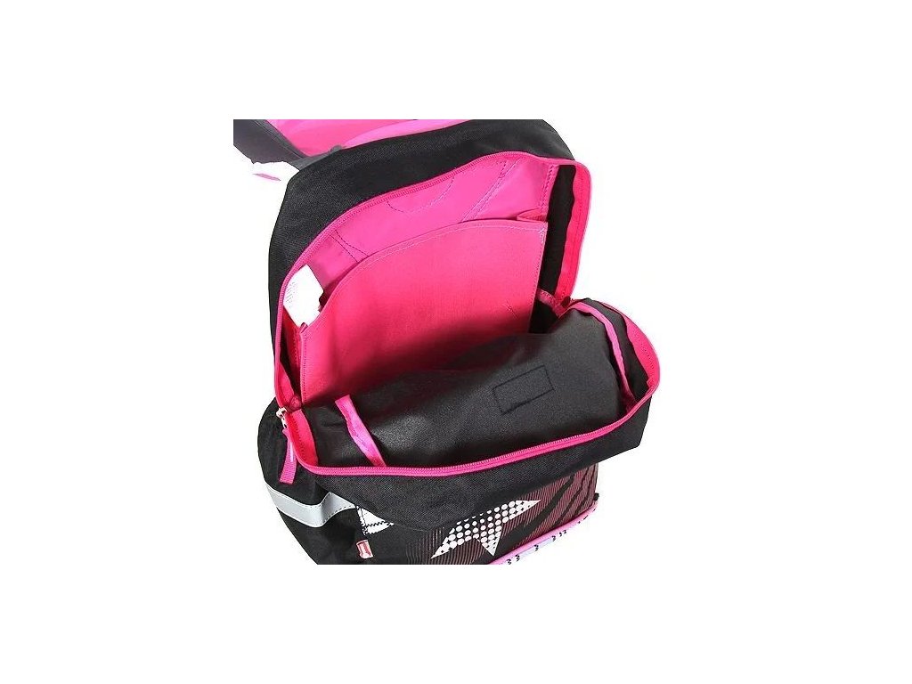 Batoh disponuje hlavní komorou opatřenou zipem, kde vnitřní prostor je oddělen přepážkou a menší vnitřní kapsou. Přední vnější kapsa na svačinu, po obou stranách batohu kapsy na láhev s pitím. Dno batohu je vyrobeno z pevného materiálu, díky němuž nedochází k jeho prohýbání či převržení. Reflexní prvky zajistí bezpečnost dětí za zhoršených světelných podmínek. V horní části poutko do ruky či zavěšení.